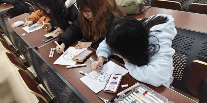 卡片制作完成后,工作人员统一收集并打乱顺序,同学们以随机抽取的方式交换彼此的作品。一份份承载创意与心意的卡片在现场流动,成为连接情感的纽带。在分享环节中,多位同学踊跃上台,表达收到卡片时的惊喜,分享对图案与祝福的喜爱,现场掌声不断。在心理健康部成员的鼓励下,一些起初腼腆的同学也积极参与交流,使温暖氛围持续蔓延。