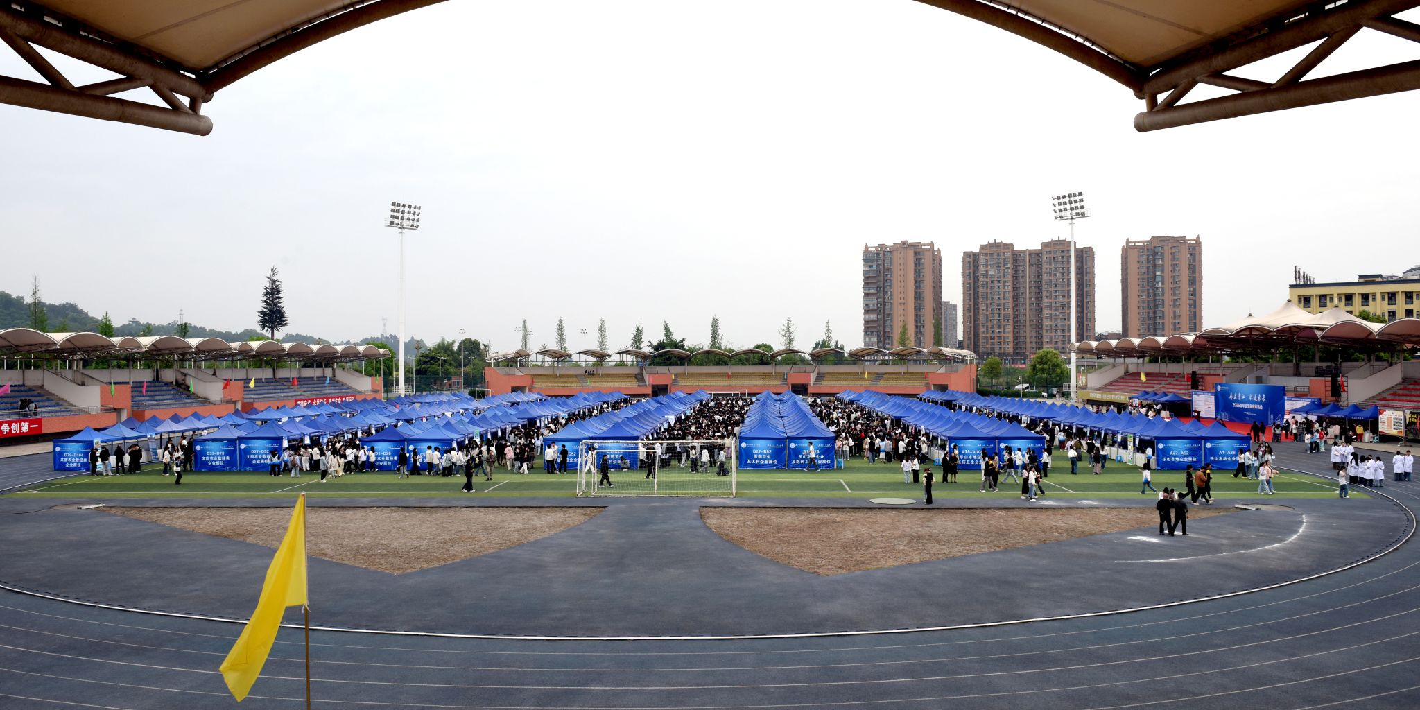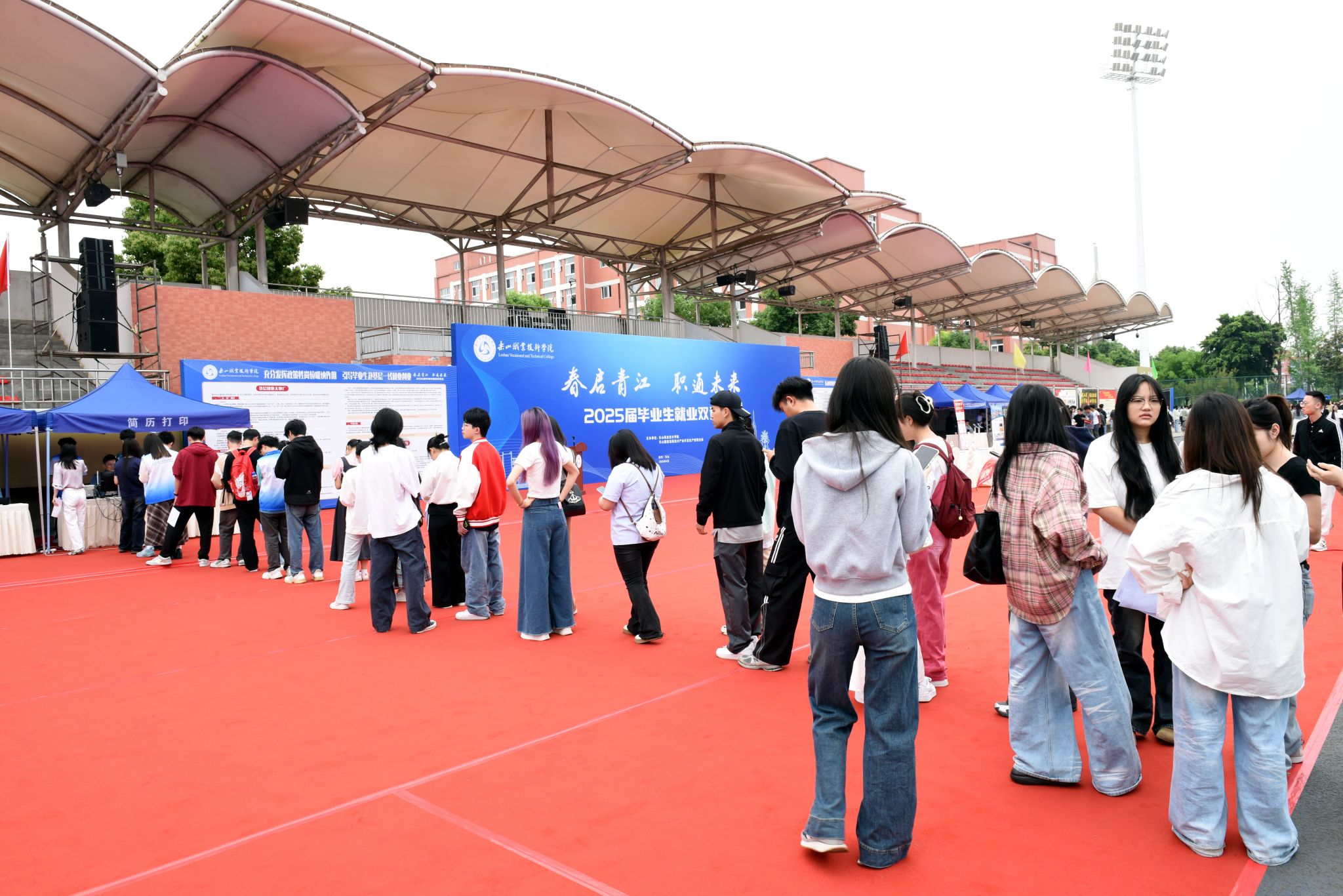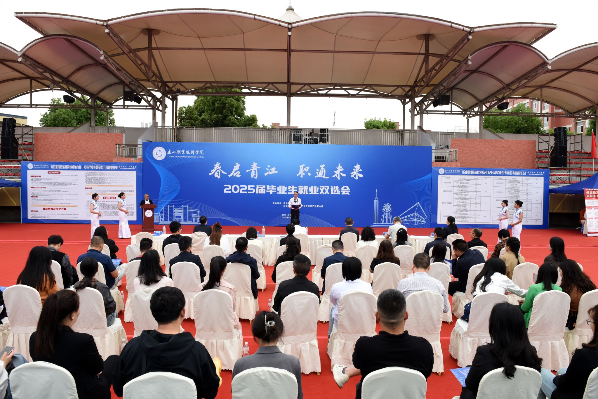4月25日,beat365英国官方网站2025届毕业生就业双选会在主运动场举办,学校党委书记成定彬出席并宣布“2025届毕业生就业双选会正式启动”。学校领导刘忠、张佳、李昌贵、张学河,乐山市人力资源和社会保障局党组成员、副局长赵川出席启动仪式,各区县人社局主要负责同志,学校相关部门和二级学院负责人,招聘企业代表,以及5000余名2025届毕业生、2026届即将离校实习生参加了启动仪式。