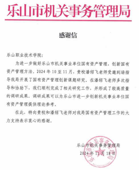 乐山市机关事务管理局对我院教师丰富的科研经验和严谨的工作态度表示了肯定,并于2024年11月18日向我院发来感谢信。
