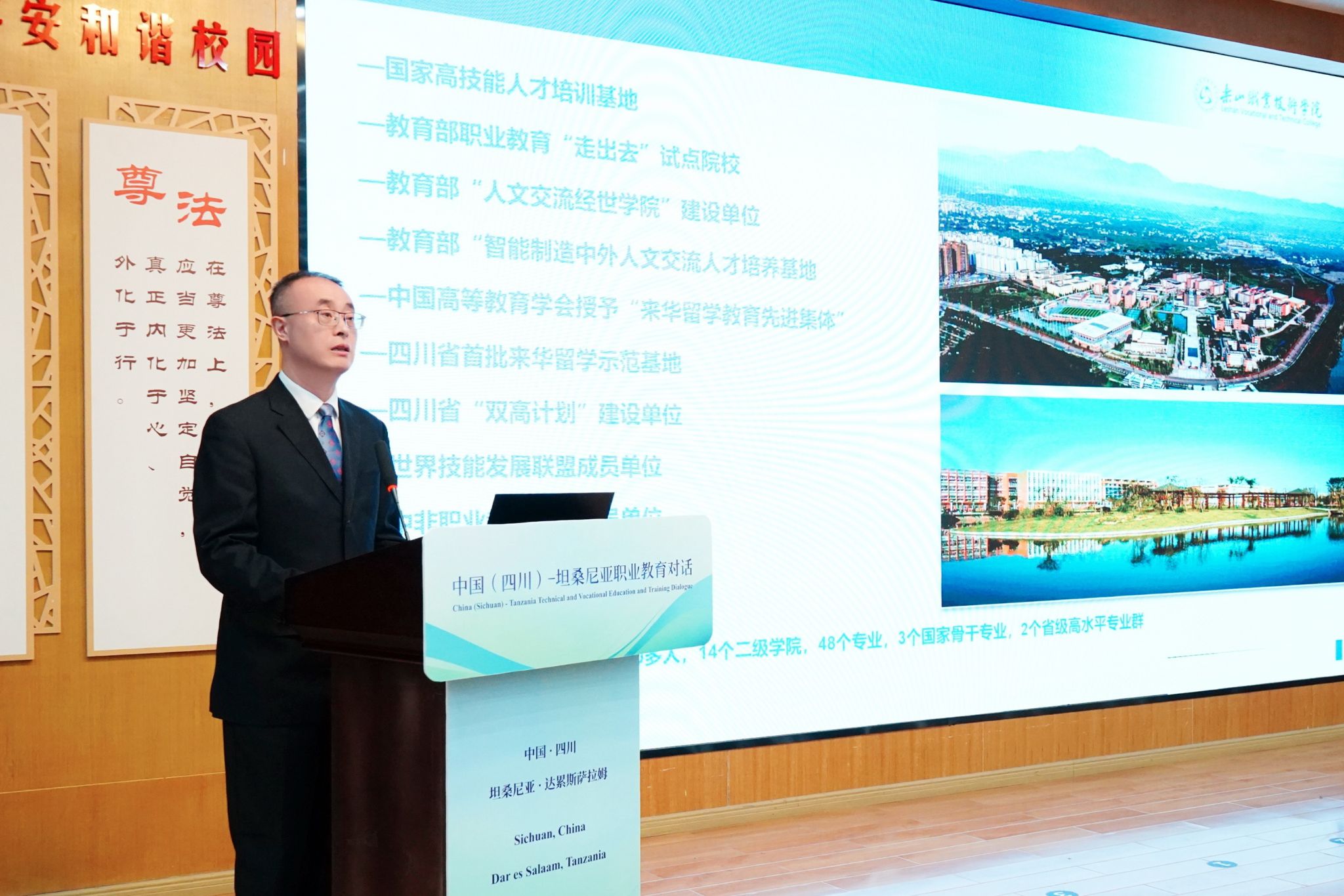 2024年12月16日下午,由四川省教育厅主办的中国(四川)—坦桑尼亚职业教育对话活动在成都举行,四川省教育厅对外交流与合作处处长、四川省教育对外交流中心主任王拉沙,四川省教育厅职业教育处副处长陈欢,坦桑尼亚职业教育委员会主席代表约瑟夫·查姆沙玛,坦桑尼亚国家交通大学、阿鲁沙会计学院等14所坦桑尼亚院校代表,成都航空职业技术学院、beat365英国官方网站等10余所川内职业院校代表以及中非职业教育联盟代表共计60余人参加了本次对话活动。beat365英国官方网站校长刘忠应邀出席活动并作主旨报告。