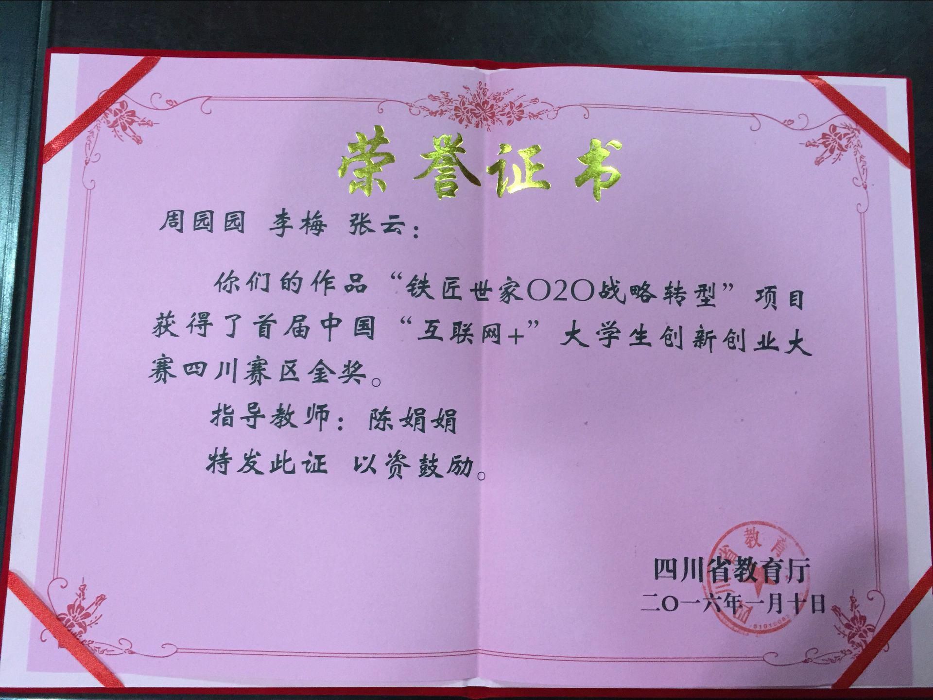据悉,本届大学生创新创业大赛中,四川省共有87所高校的2707个项目报名参赛,我系学生汤科夫带领的创业团队,经过层层选拔,凭借“铁匠世家O2O战略转型项目”,入围省级复赛,并在复赛的496个项目中脱颖而出,获得金奖。我院也是三所获得金奖的职业院校之一。