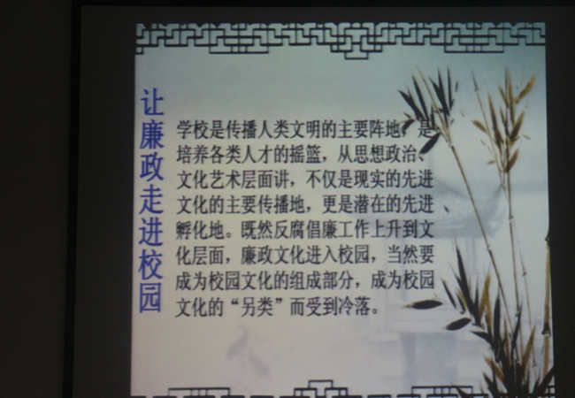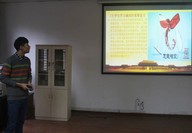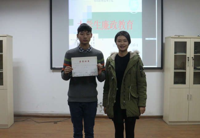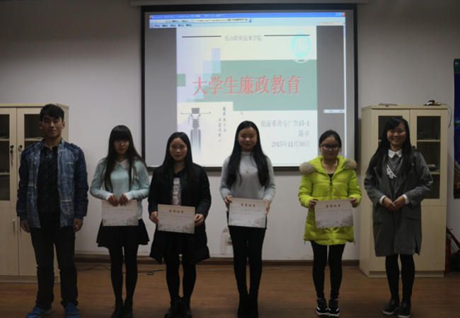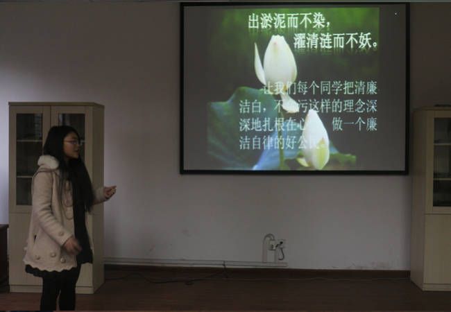 这是15级大一新生首次参加这类活动。大家都以积极的心态做了准备工作,ppt的演示内容围绕“大学生廉政教育”而展开,丰富多彩,各具特色。在演讲中,同学们有的采用清廉和贪污的相反教材来为大家阐述廉政,有的从当代人物习近平总书记的决定中来展示廉政,真是“前有古人,后有来者”。参赛同学用其生动的画面演示和滔滔不绝的演讲向我们传播着廉政的重要性和当代社会我们所存在的问题,深刻的揭示了当代政治中的腐败现象,提醒着作为新一代大学生我们应该反腐反贪,拥有正直、诚实的品质,并意识到廉洁并不只是为官者的事,大学生也应该从自身做起,做到廉洁清正。