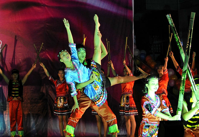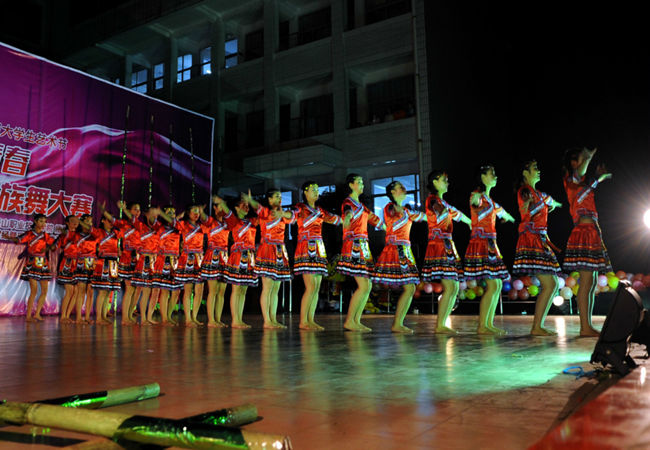 舞台上灯光璀璨,比赛现场充满了民族风情的味道,各式各样的民族服装为现场营造了民族气氛。十个参赛团队依次登场,伴随着音乐的旋律他们在舞台上翩翩起舞,宛若一个个活泼的精灵,他们的舞姿或曼妙飘逸或轻巧灵动,从不同的角度与层面演绎了舞蹈的美妙意蕴。有彝族舞、蒙古舞、朝鲜舞等不同类型的舞蹈,旅游系各位同学用肢体的律动向我们展示着苗族的美妙风情,一支“幸福苗寨”点燃了全场的热情,旅游系同学们用竹竿等道具搭配民族服装将大家带到了苗族晚会现场,构建了一幅人与自然和谐相处的画面,现场观众打开了手机手电筒进行摇摆与台上幸福苗寨形成完美的一幅动态画面,传达了给大家带来了视觉上的盛宴,感受到了苗族的异域风情。荣获了学院三等奖,这是他们付出汗水与精力收获的成果。