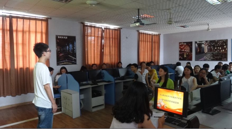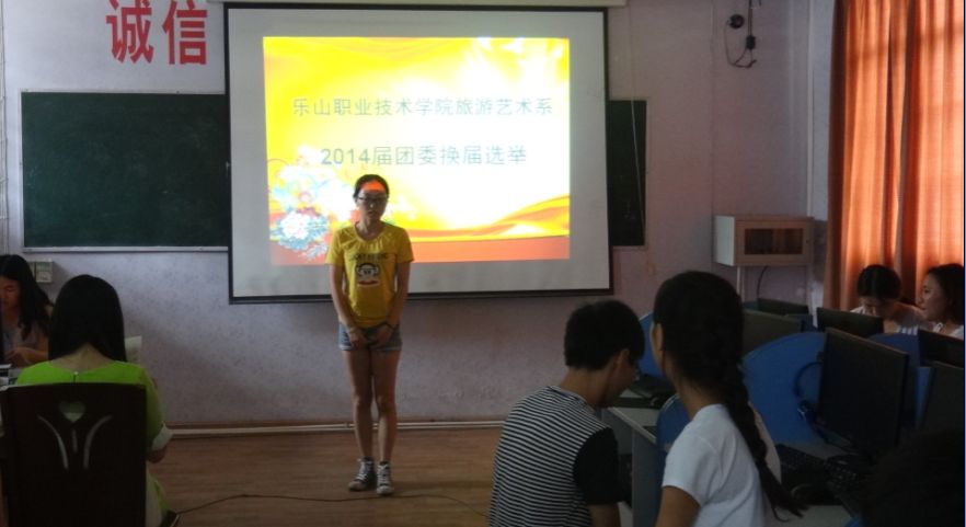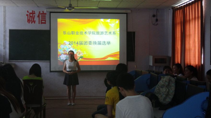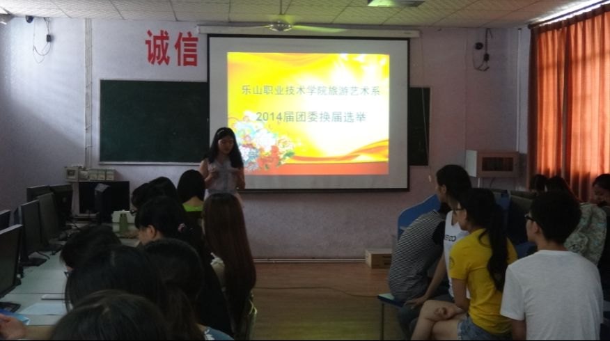 6月18日中午12点半,旅游系团委在多媒体教室开展了14级团委干部换届选举,团委刘诗妍老师及各部门部长参加了评选。