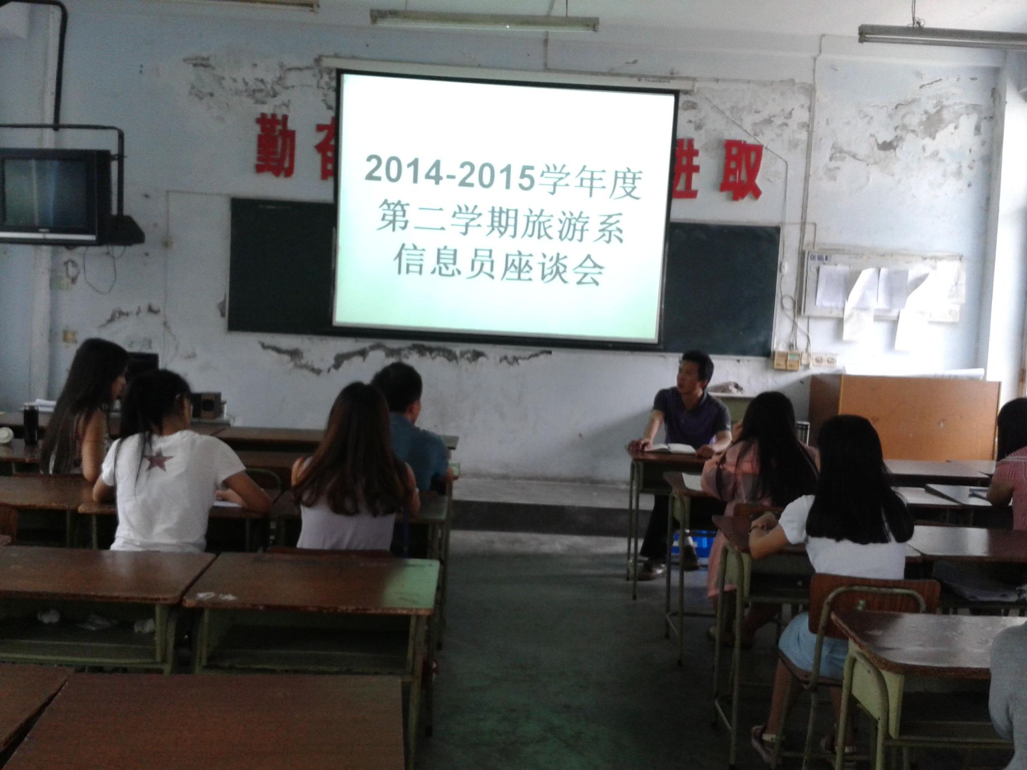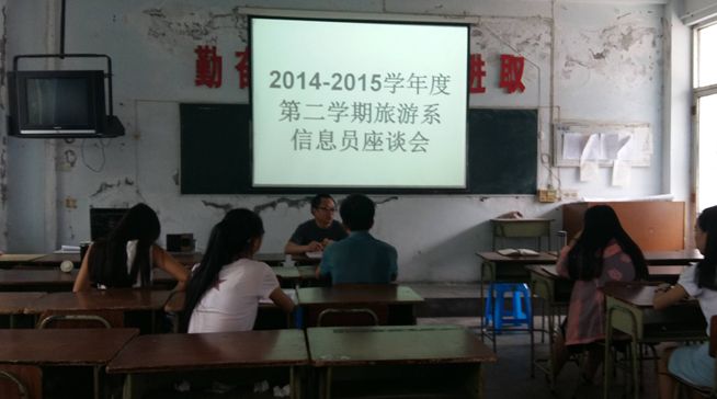 为了解本期以来学生的学习情况,听取学生对各班科任老师的教学反映及其他情况,2015年6月18日中午13时,旅游系在二楼多媒体教室组织召开了由各班信息员参加的座谈会,系教学副主任何加健、教务管理工作人员刘永生参加了会议。各班信息员就本班学生的自主学习情况、对课程教材的意见、对教师的教学及纪律、对后勤保障等问题都进行了意见反馈。何加健副主任对学生反映的有关问题分别给学生进行了解答,并将学生反映的其他问题记录下来,拟与相关部门进行沟通。
