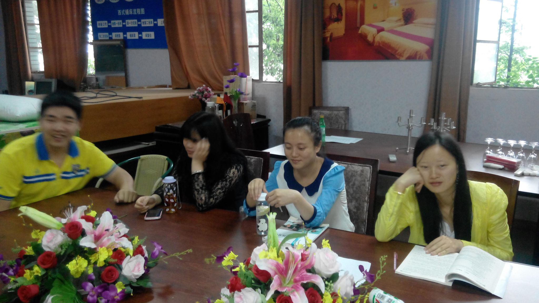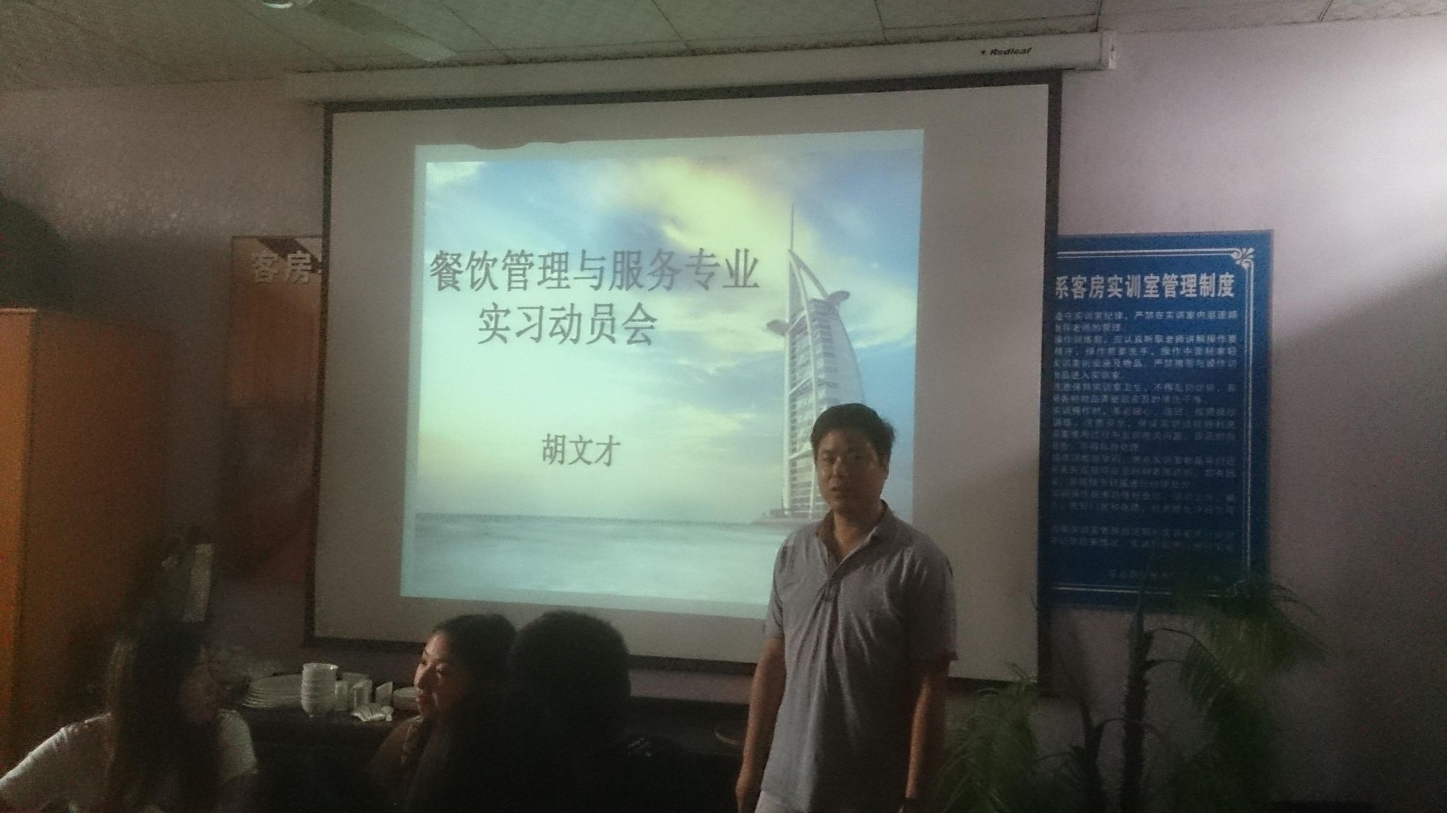 2015年5月20日下午,餐饮管理与服务专业学生在客房实训室召开了2013级学生实习动员大会。专业主任胡文才向同学们简要介绍了学院顶岗实习管理。并对同学们的实习提出了三点要求: 一.珍惜此次带薪实习的机会,在实习中主动到艰苦岗位上去磨练,发扬不怕苦的精神。二.认真践行实习职责,以踏实的作风和严肃的态度,虚心学习,进一步提高自己的专业技能。三.特别强调实习期间的安全问题,不迟到早退、不脱岗,遵守一切规章制度。最后,希望同学们认清当前就业形势,认真实习。