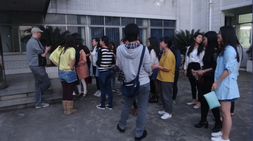 几位外国友人与同学们通过彼此介绍,了解了同学们在学校的一些生活情况及课后活动。同学们也介绍了一些学校的趣事和乐山的美食。