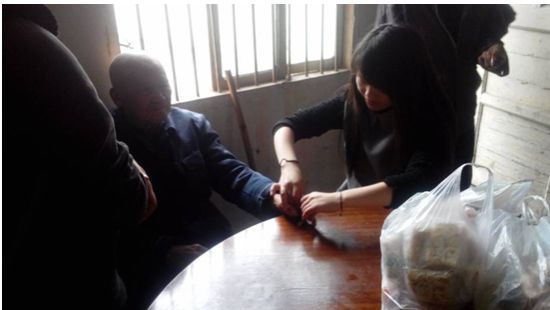 下午两点左右,同学们带着激动的心情和特意给老人们准备的食物很快到达敬老院。任院长和老人们用热烈的掌声欢迎我们的到来,我们真切的感受到了他们的热情,聊天之后,我们为老人按摩、剪指甲,在此过程中,老人们也不忘用他们的生活经历来劝导我们努力学习,认真生活。
