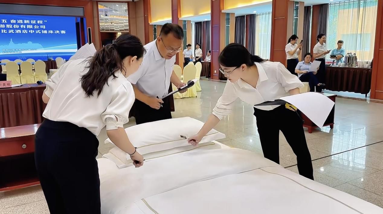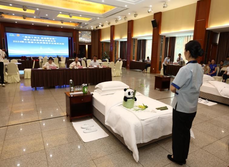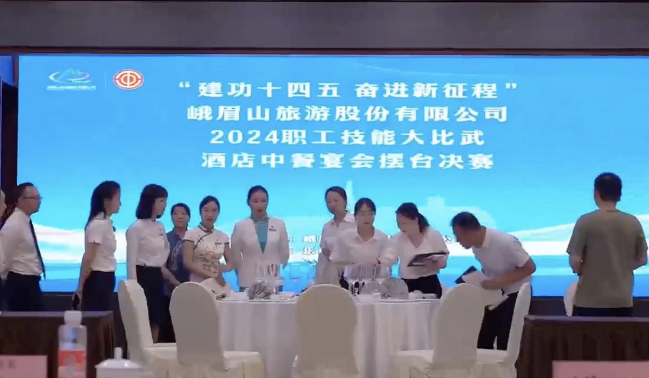 2024年6月21日由峨眉山旅游股份有限公司主办的“奋进新征程”2024年职工技能大比武活动在峨眉山旅游股份有限公司峨眉山大酒店分公司举办,beat365文化旅游学院教师李奥萌受邀参与酒店中式宴会摆台、酒店中式铺床决赛裁判工作,本项目决赛共有30多位酒店职工参加。