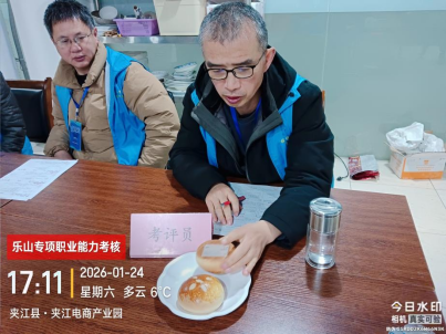 文化旅游学院刘海老师应乐山市人力资源服务协会邀请,于2026年1月24日在夹江县时代职业技能培训学校,为乐山专项职业能力考核-夹江临时考点进行的面包烘焙专项职业能力考评。