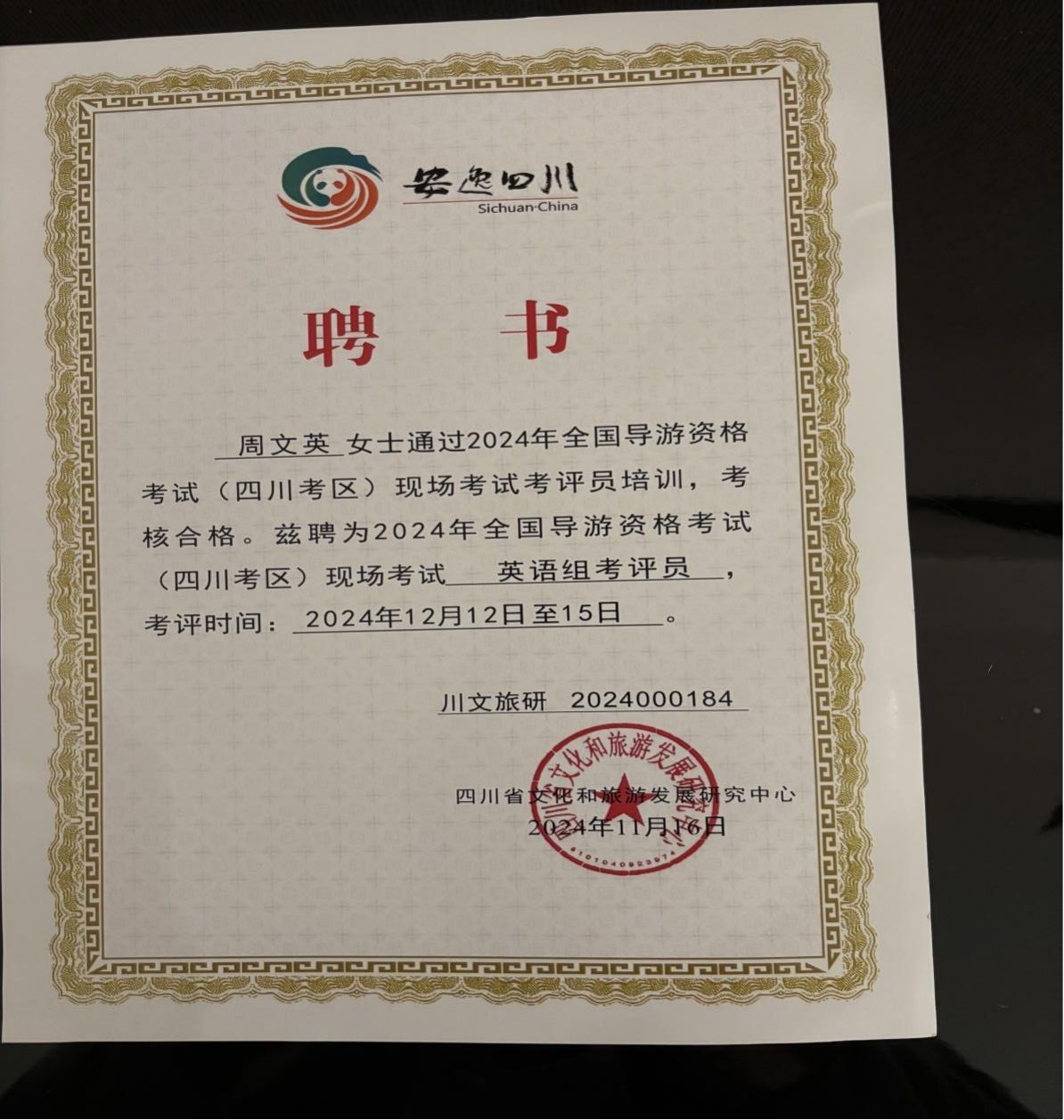 2024年全国导游资格考试(四川考区)现场考试评阅卷工作于2024年12月9日-15日在成都举行。考评员名单是在符合要求的考评员库中随机抽取的。文化旅游学院教师刘琼英、周文英参加了此次评阅卷工作。两位老师严格按照考评流程、考评标准认真评卷、阅卷,高标准、高质量、高水平地完成了考评工作。