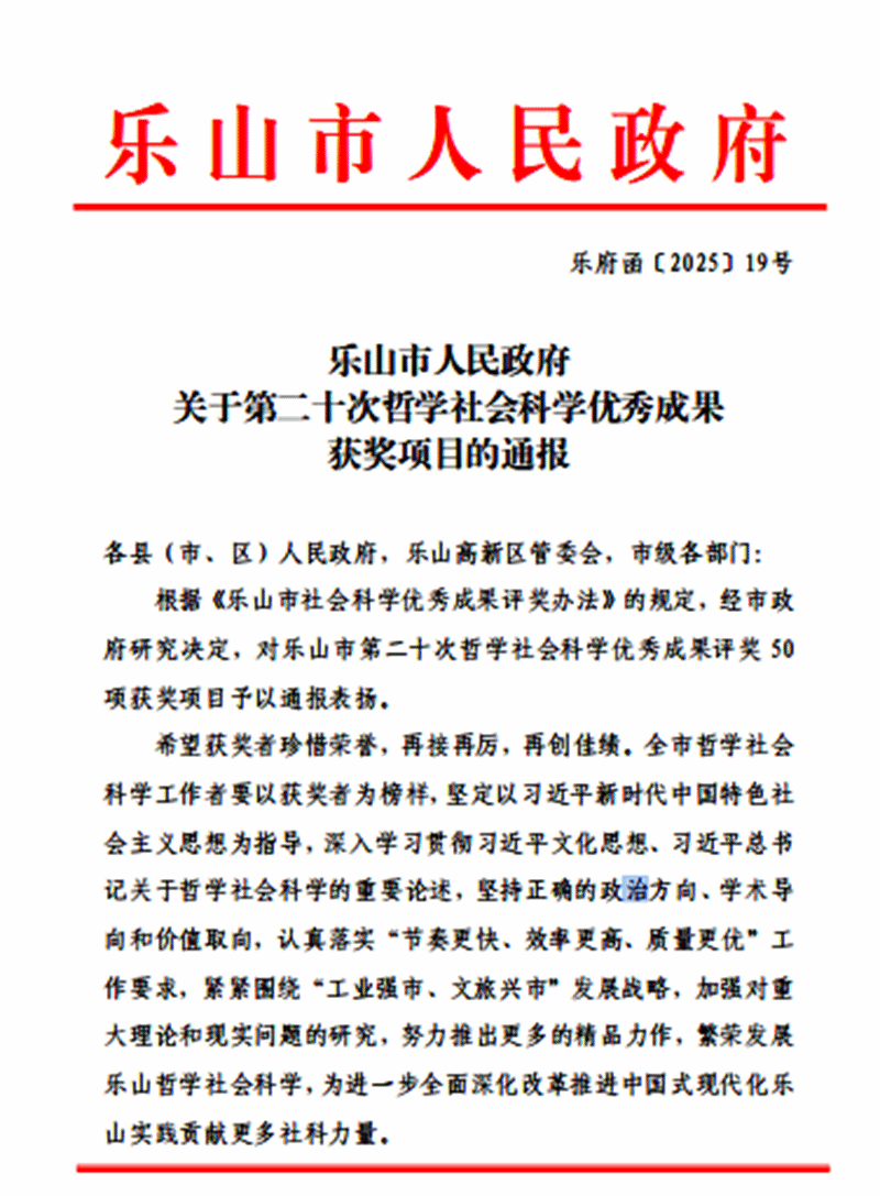 本次评选活动由乐山市人民政府组织,经市级各社科学会(协会、研究会)、县(市、区)社科联和高校社科联资格审查、市哲学社会科学评奖委员会办公室资格审核、专家组初评、市社科联主席办公会复评,市评奖委员会审议通过获奖成果共50项,其中:一等奖5项、二等奖15项、三等奖30项。马克思主义学院刘晓锐老师以系列论文成果参与了项目申报。经市政府专家组严格评审,刘晓锐老师的系列论文成果获评委一致认可,荣获市政府“三等奖”表彰。