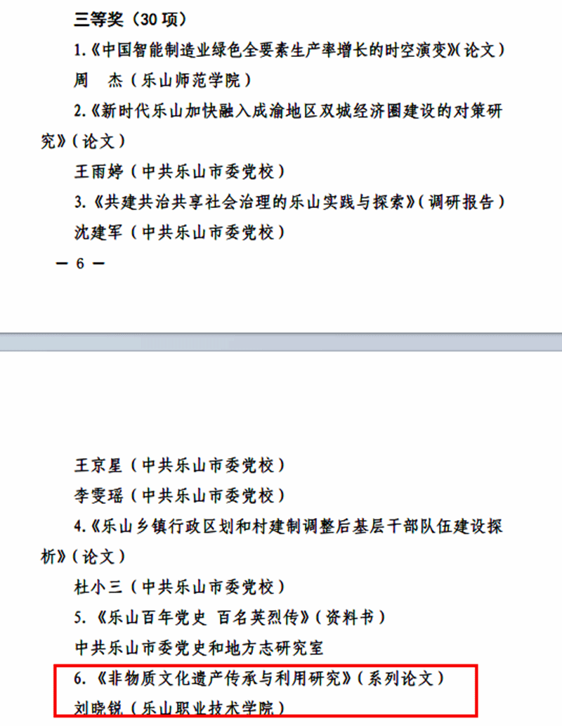 2025年2月,乐山市人民政府发布《关于第二十次哲学社会科学优秀成果获奖项目的通报》,马克思主义学院青年教师刘晓锐的系列论文《非物质文化遗产传承与利用研究》荣获乐山市第二十次哲学社会科学项目优秀成果三等奖。