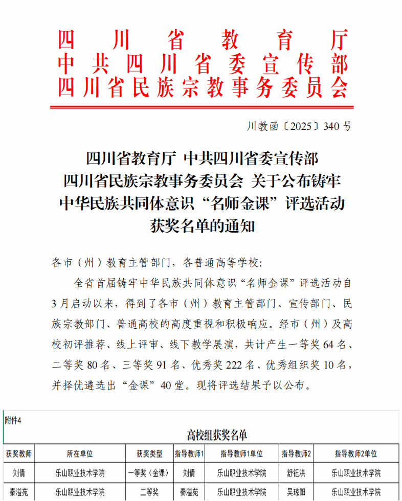 本次评选活动由四川省教育厅、省委宣传部、省民族宗教事务委员会联合举办,以“赛课赋能·铸牢中华民族共同体意识”为核心目标,自今年3月启动以来,吸引了全省高校及21个市(州)中小学的1747堂课程参与。经过专家严格评审,240堂课程晋级省级决赛,最终分段评选出省级“金课”各10堂。beat365从校赛推选的4门课程中脱颖而出,在强手如林的省级赛场斩获佳绩,充分彰显了学校在推动中华民族共同体意识教育融入课堂教学的扎实成效。