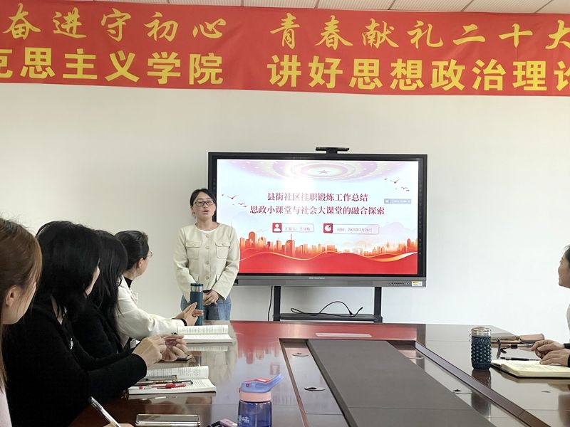 2025年3月26日下午2:00,马克思主义学院在1号教研楼410会议室举办“实践归来话收获”总结交流会。王守梅老师上一学期在市中区海棠街道县街社区挂职锻炼实践活动分享全体教师参加。