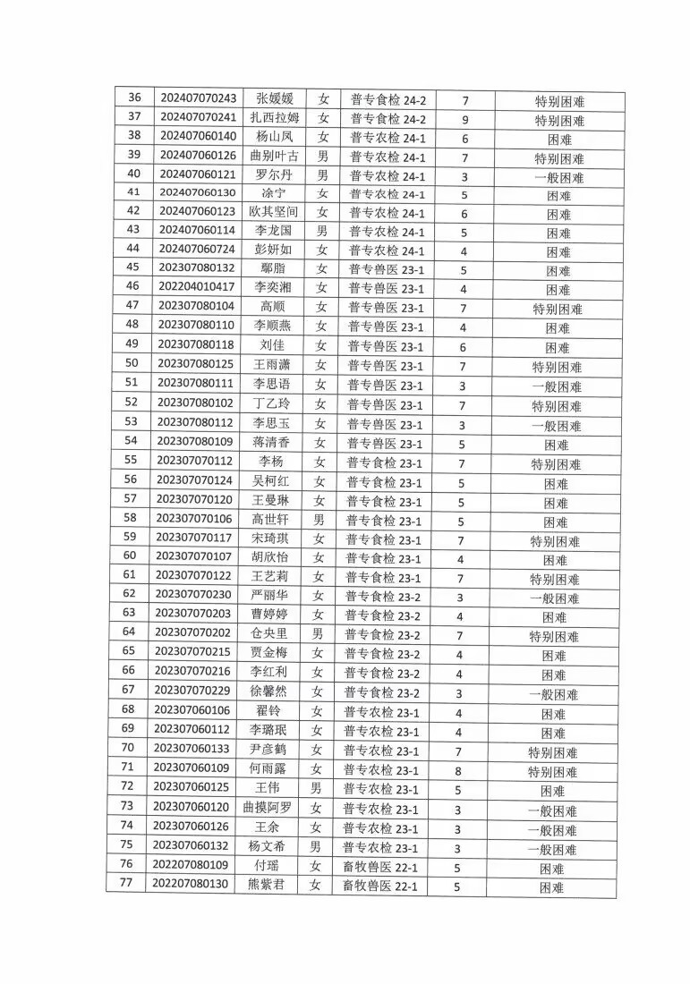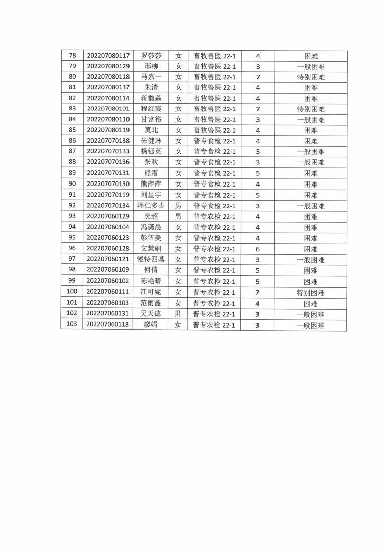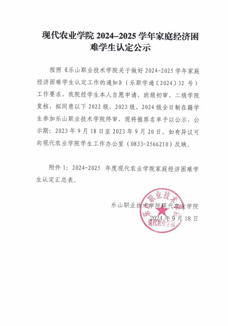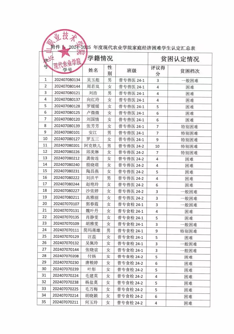 现代农业学院2024-2025学年家庭经济困难学生认定公示