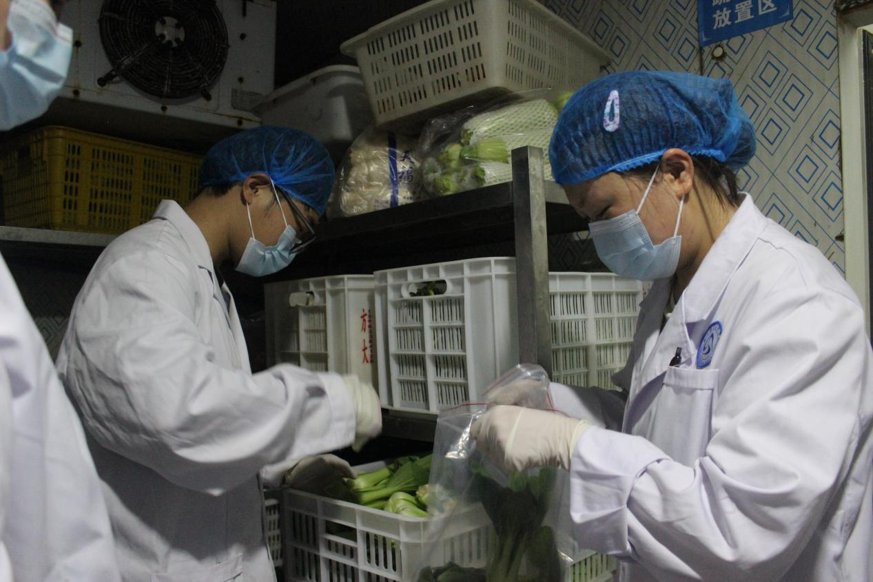 活动开始前,两位指导老师围绕食品安全重要性、样品采集要求、快速检测样品技术要领等进行了详细讲解,随即带领同学们采集了瓢儿白、香菜、小白菜等8类样品。在食品安全检测实验室,两位指导老师带领同学们对所采样品的过氧化值、农药残留、酸价等指标进行了检测和认真分析,并将检测结果向一号食堂进行了反馈。