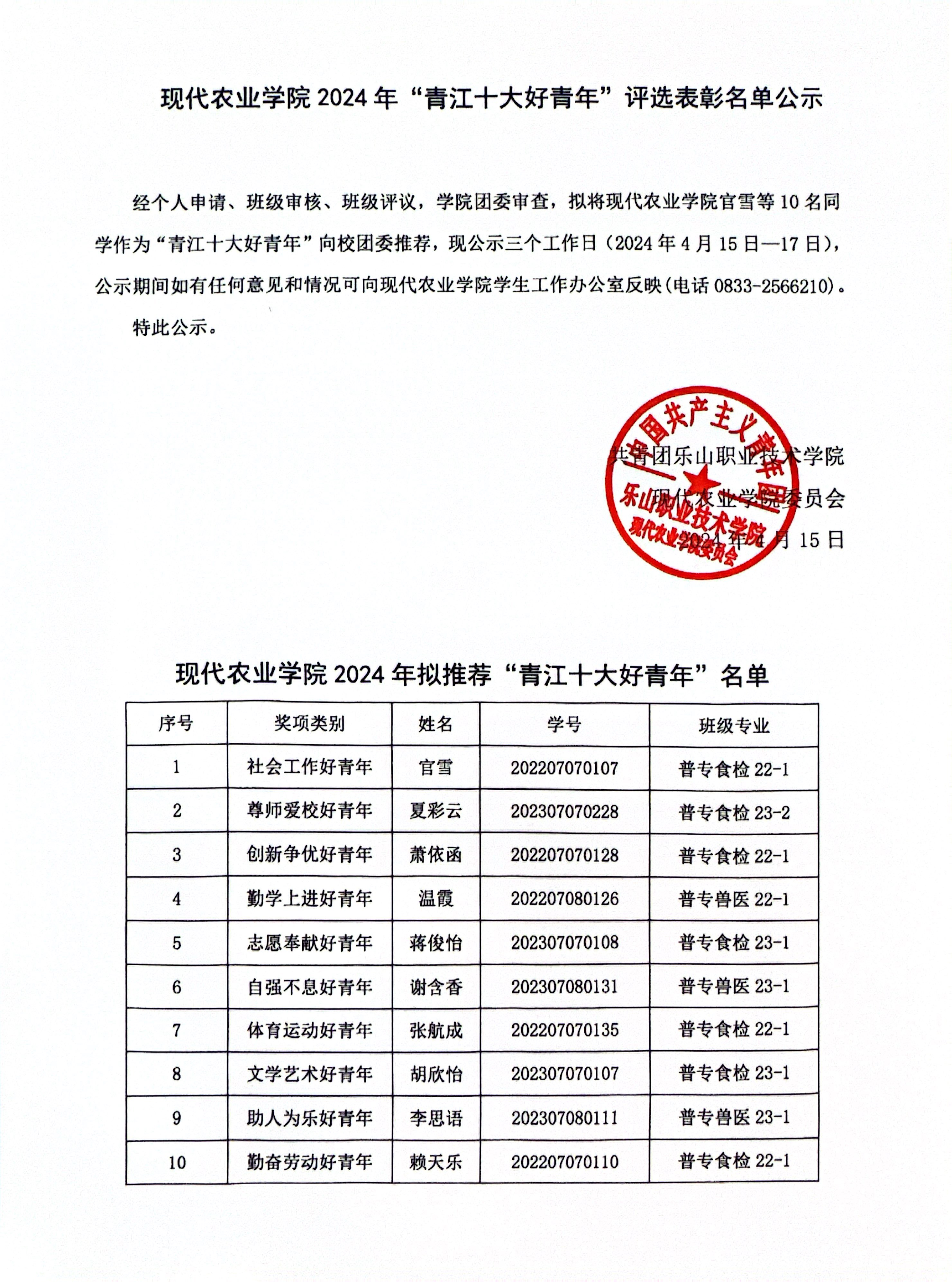 现代农业学院2024年“青江十大好青年”评选表彰名单公示