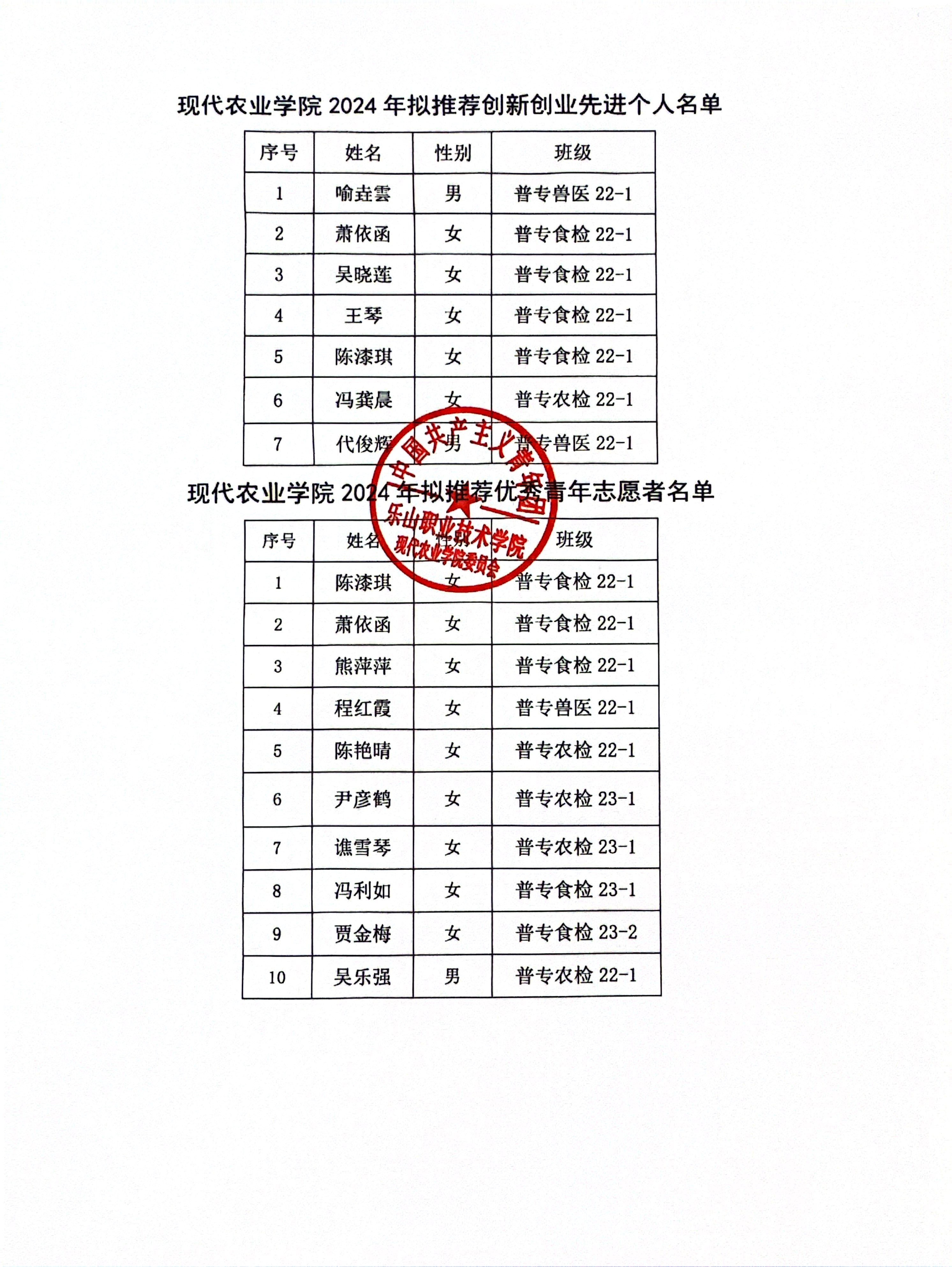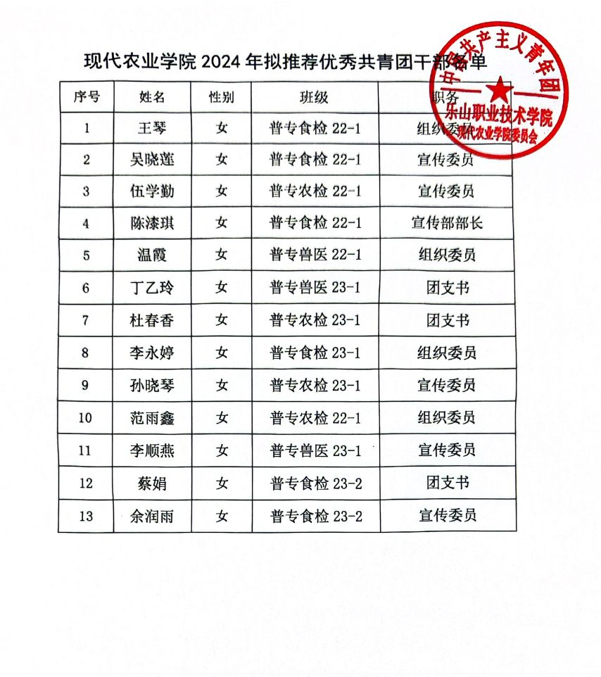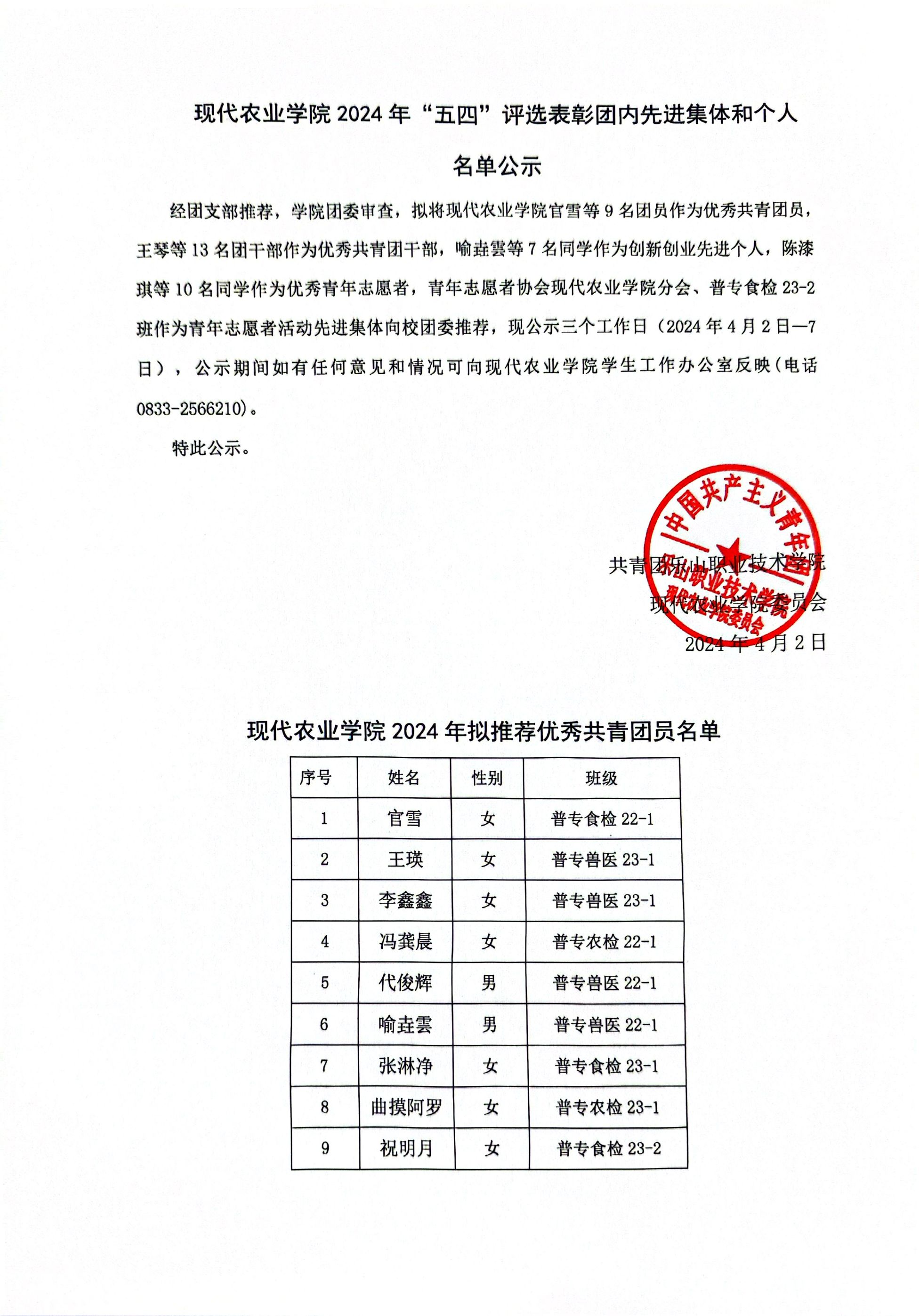 现代农业学院2024年“五四”评选表彰团内先进集体和个人名单公示