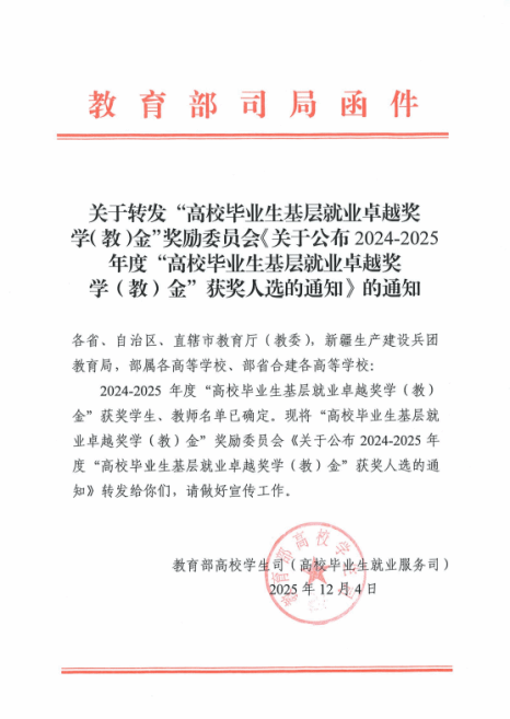 “高校毕业生基层就业卓越奖学(教)金”由教育部高校学生司(高校毕业生就业服务司)、教育部学生服务与素质发展中心共同指导,中国长江三峡集团出资,中国教育发展基金会设立,旨在贯彻落实党中央、国务院关于引导和鼓励高校毕业生到基层就业的决策部署,奖励赴基层就业创业并作出突出业绩的普通高校毕业生和普通高校指导服务大学生赴基层就业工作有突出贡献的教师。2025年,全国共有418名优秀高校毕业生获此殊荣,其中,四川省高校仅20名。