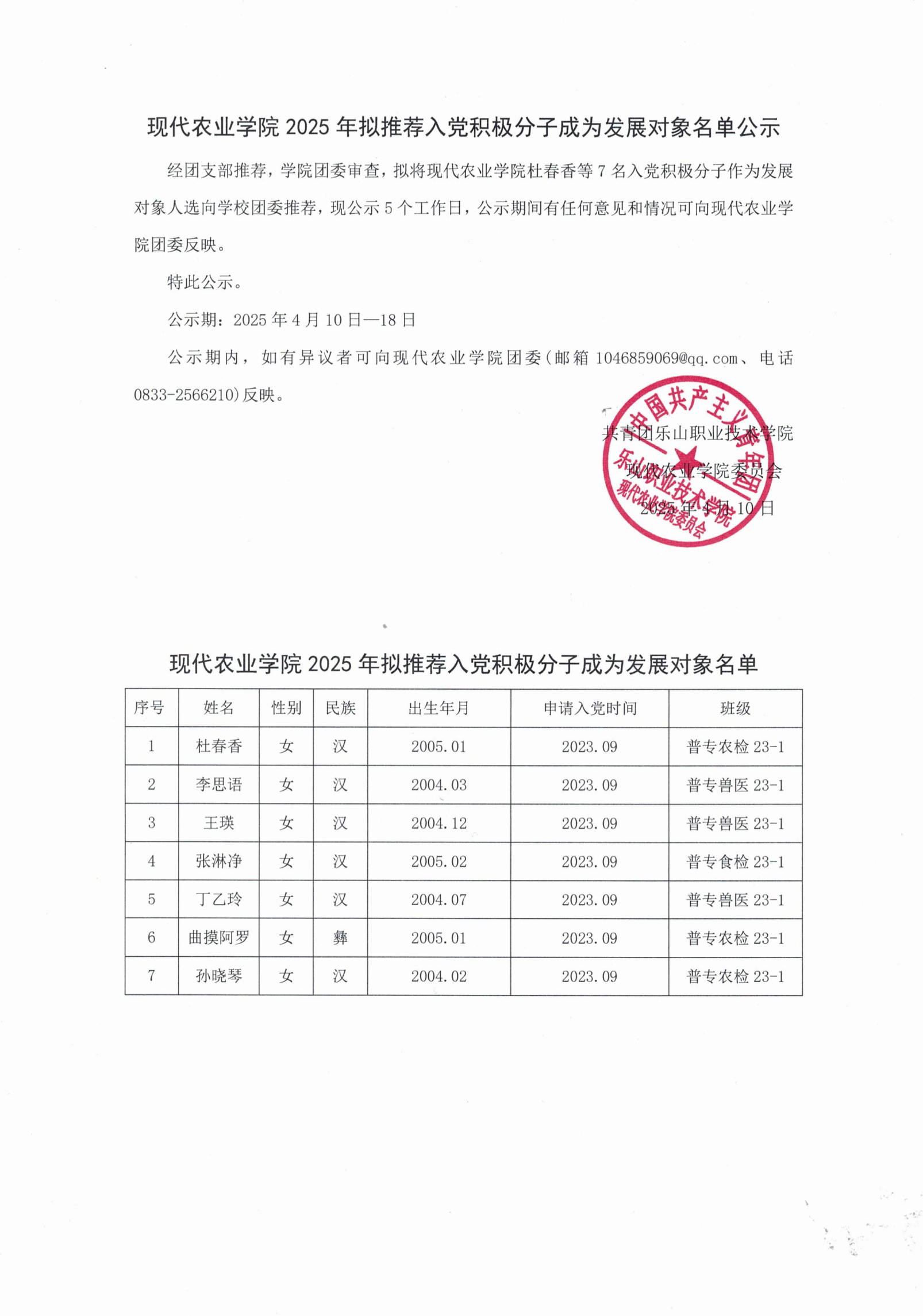 现代农业学院2025年拟推荐团员成为入党积极分子名单公示