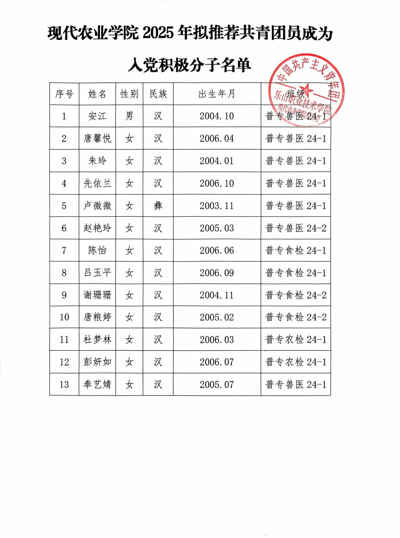 现代农业学院2025年拟推荐共青团员成为入党积极分子名单公示