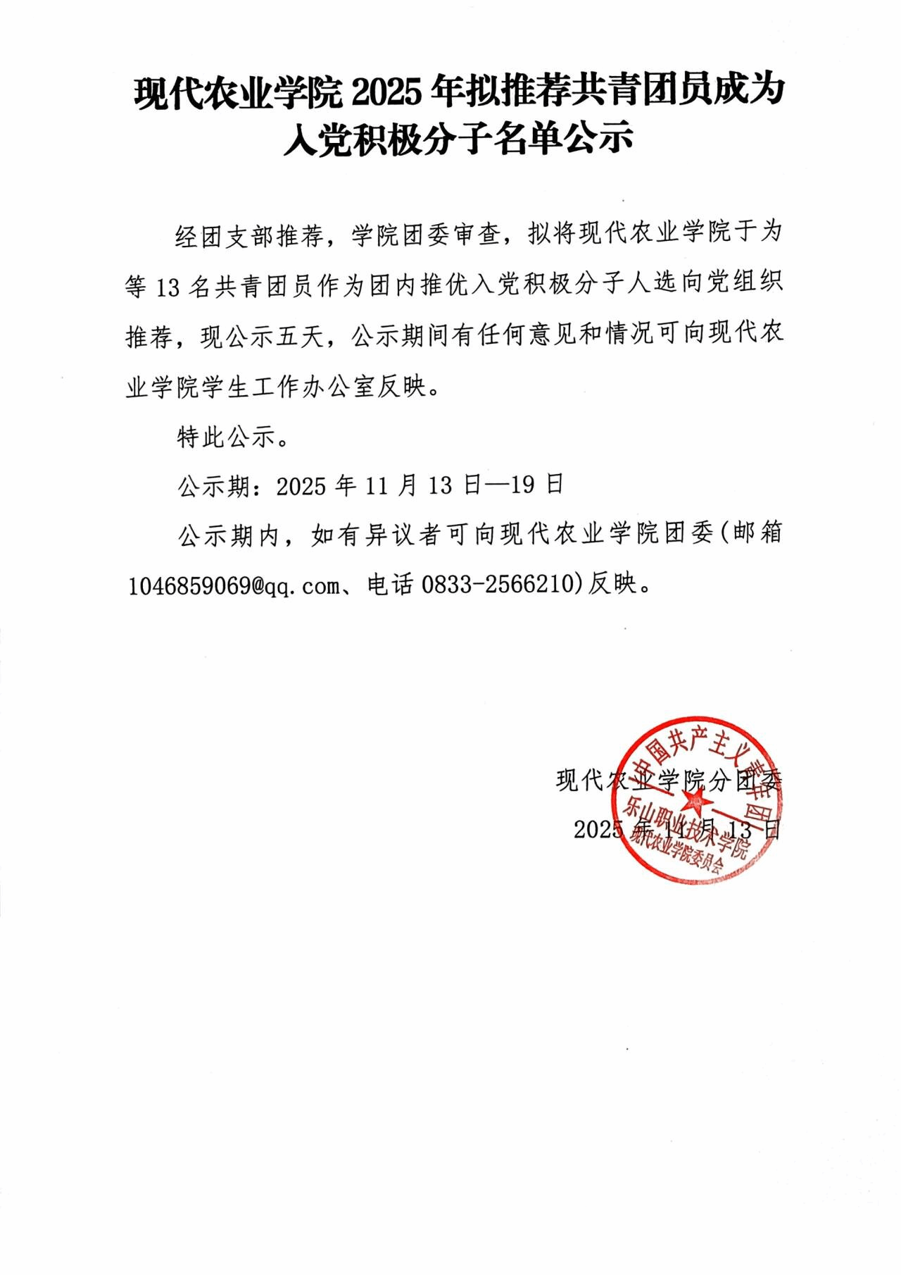 现代农业学院2025年拟推荐群众成为共青团员名单公示