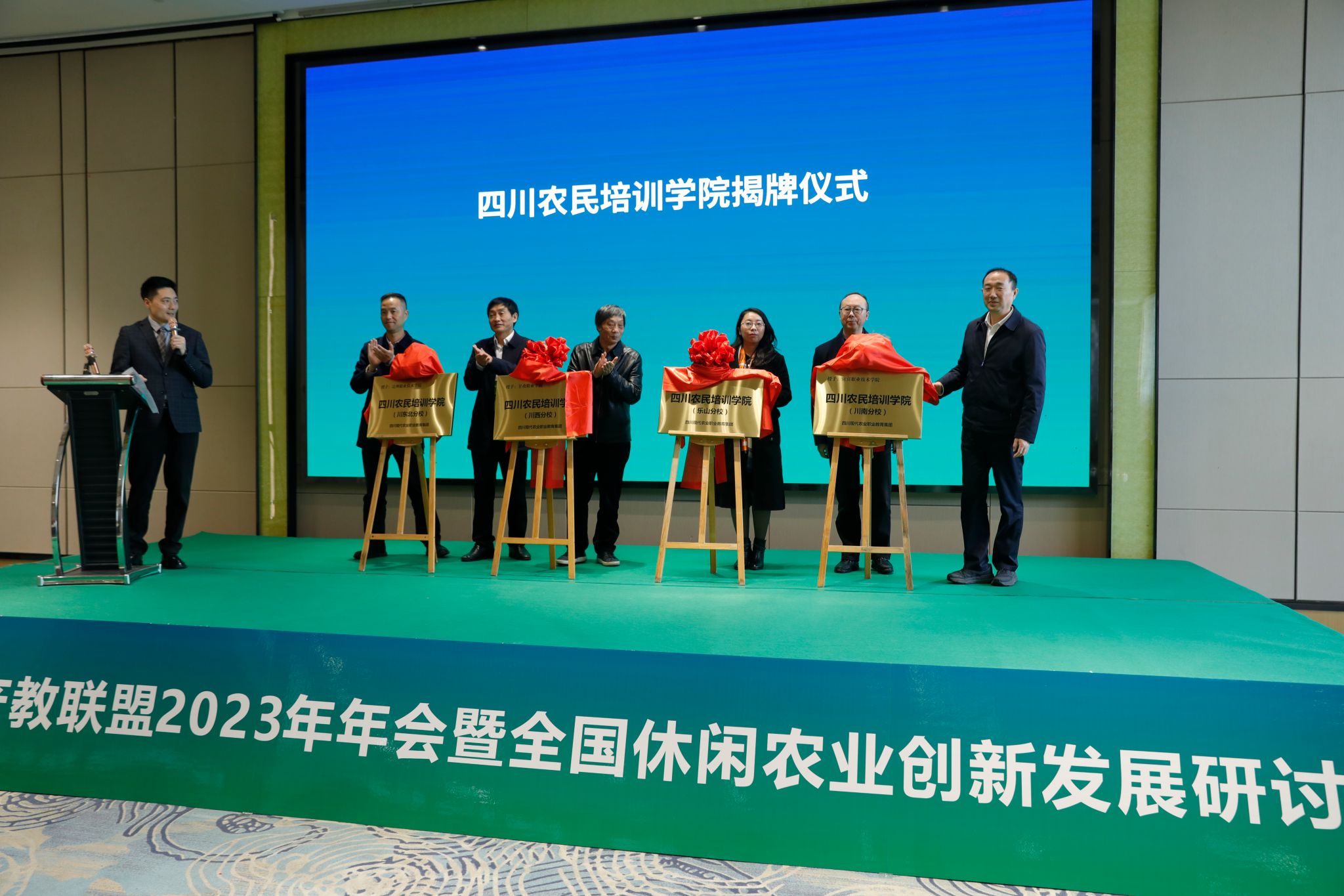 2023年12月6日,四川农民培训学院揭牌仪式在中国休闲农业产教联盟2023年会上举行。全国农村产业融合发展联盟、省农业农村厅相关领导出席会议,全国涉农相关院校、企业代表200余人参加了会议。学院党委委员、副校长周芹应邀为四川农民培训学院揭牌。据悉,四川农民培训学院是由成都农业科技职业学院发起,按照四川省“五区共兴”布局,由省内综合实力强,有农林牧渔类专业及师资队伍支撑,在农业农村农民培训中贡献多且经验丰富的单位联合组建而成的,致力于打造四川高素质高技能农民的社会培训基地和终生学习平台。联合体成员分别是位于成都平原的成都农业科技职业学院、川西南的beat365英国官方网站、川南的宜宾职业技术学院、川东北的达州职业技术学院、川西高原的甘孜职业学院及深圳市天天学农网络科技有限公司。 下一步,学院将借助“四川农民培训学院”平台,坚决落实四川省委十二届二次全会提出“以‘四化同步、城乡融合、五区共兴’为总抓手,统揽四川现代化建设全局”的精神,充分发挥学院在推进四川乡村振兴、实现农业现代化中的作用,助力将“四川农业大省金字招牌擦得更亮”。