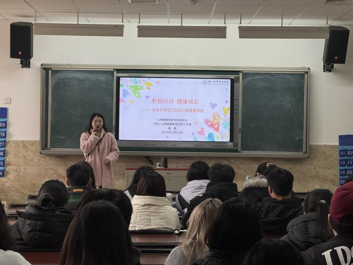 在知识讲解环节,谢毅从心理学角度剖析压力本质、来源以及压力识别,并开展“压力圈圈”测试让同学们直观感受自身压力水平。同时,她分享了“共情沟通法”、“四象限法则”、“八正法”等心理调节方法,引导学员科学认识压力,树立主动调节、积极面对的健康心态。课程强调,积极的心态是应对压力的核心,鼓励大家在服务同学、锻炼能力的同时,更要关注自身心理状态,学会平衡多重角色。现场氛围融洽,学员们互动频繁,大家在倾听与交流中获得了实用的心理调适技能,增强了应对未来学习与工作挑战的信心。