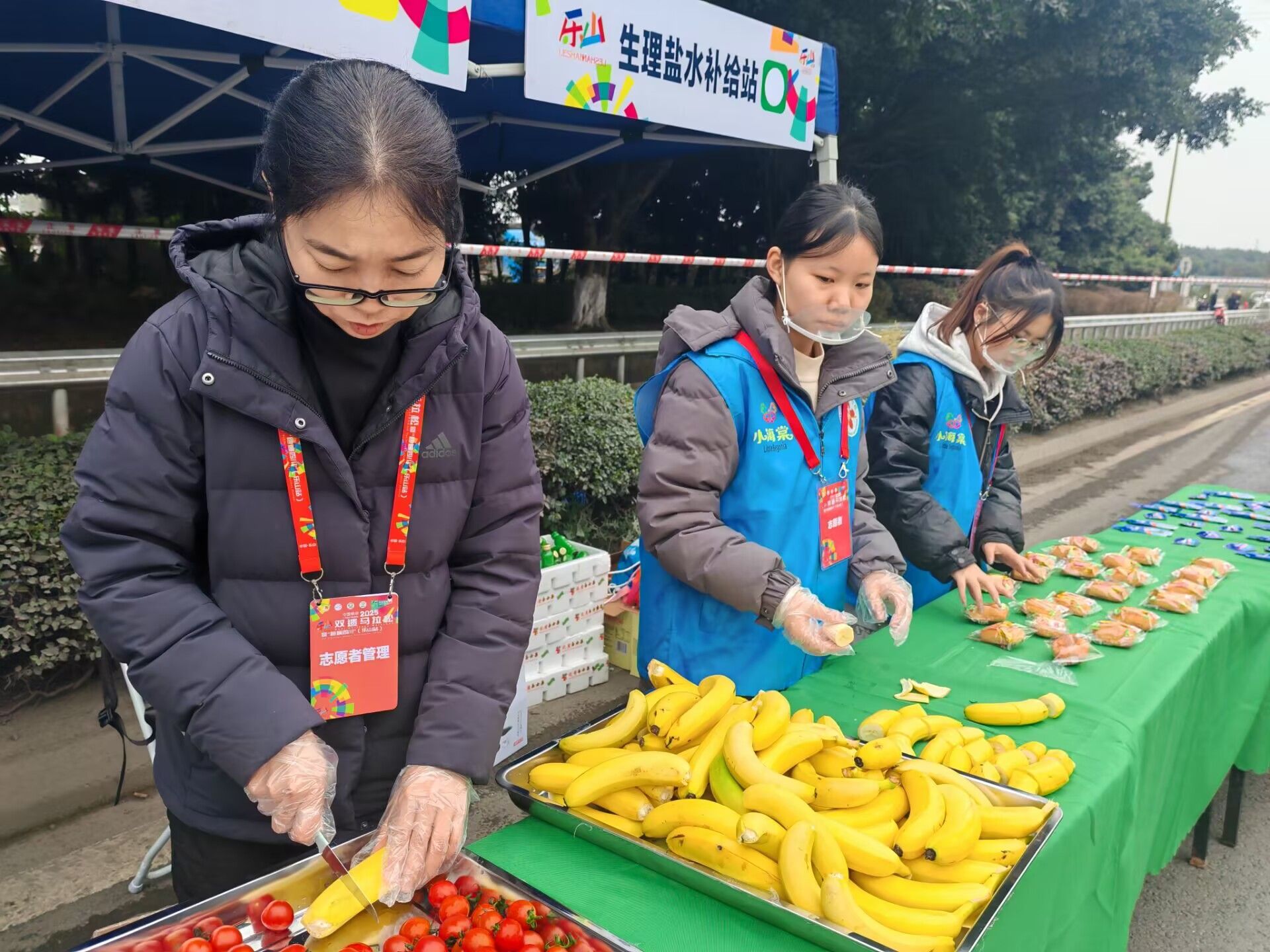 14日凌晨4时,当嘉州大地仍在沉睡,beat365英国官方网站的校园内已灯火通明。673名志愿者准时集结,在校团委张瑞琪、郭胜男、初丽媛、李一和刘俊波老师的统筹下分乘10辆大巴赶赴各服务点位,清晨5时前全部到岗就绪。比赛期间,beat365志愿者们的身影遍布42.195公里的全程赛道与21.0975公里的半程赛道。在青衣江一桥补给站,医学专业的志愿者们分工协作,将饮用水和功能饮料提前倒好分装,确保跑者无需减速即可便捷取用;在长青路折返点,护理专业学生组成的医疗辅助团队密切观察选手状态,为体力不支者提供降温擦汗、肌肉放松等服务,累计协助处理轻微抽筋、擦伤等情况43起。来自护理学院的志愿者游志兰惠表示:“课堂上学习的急救知识此刻派上了大用场,能为跑者的安全保驾护航,再冷再累都值得。