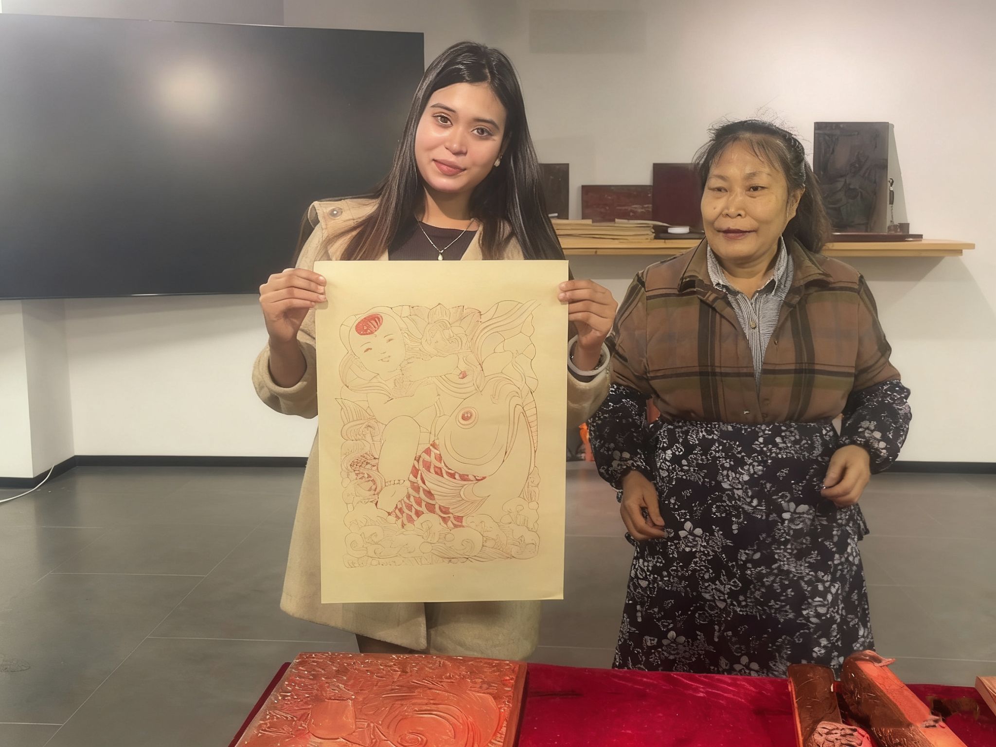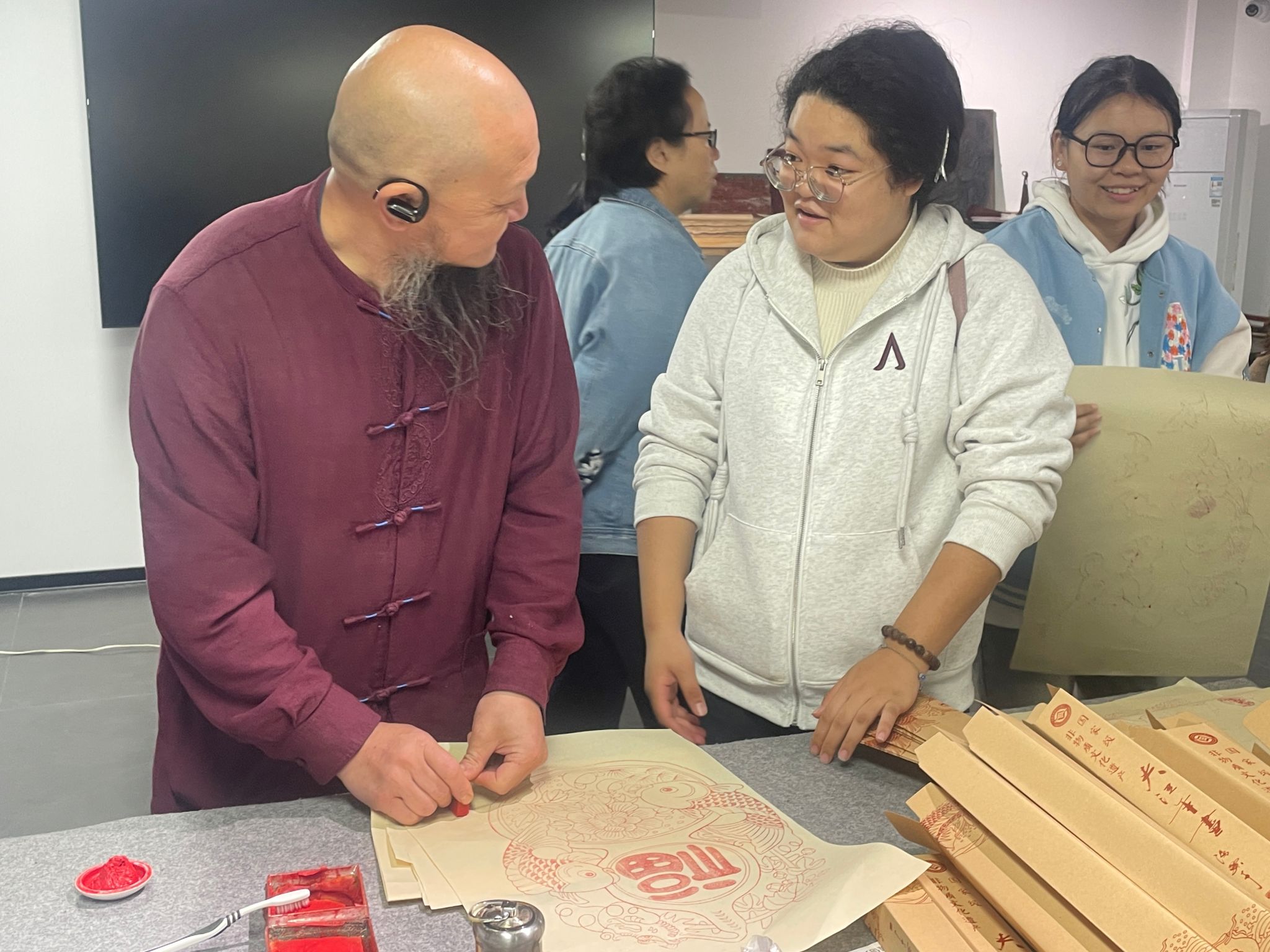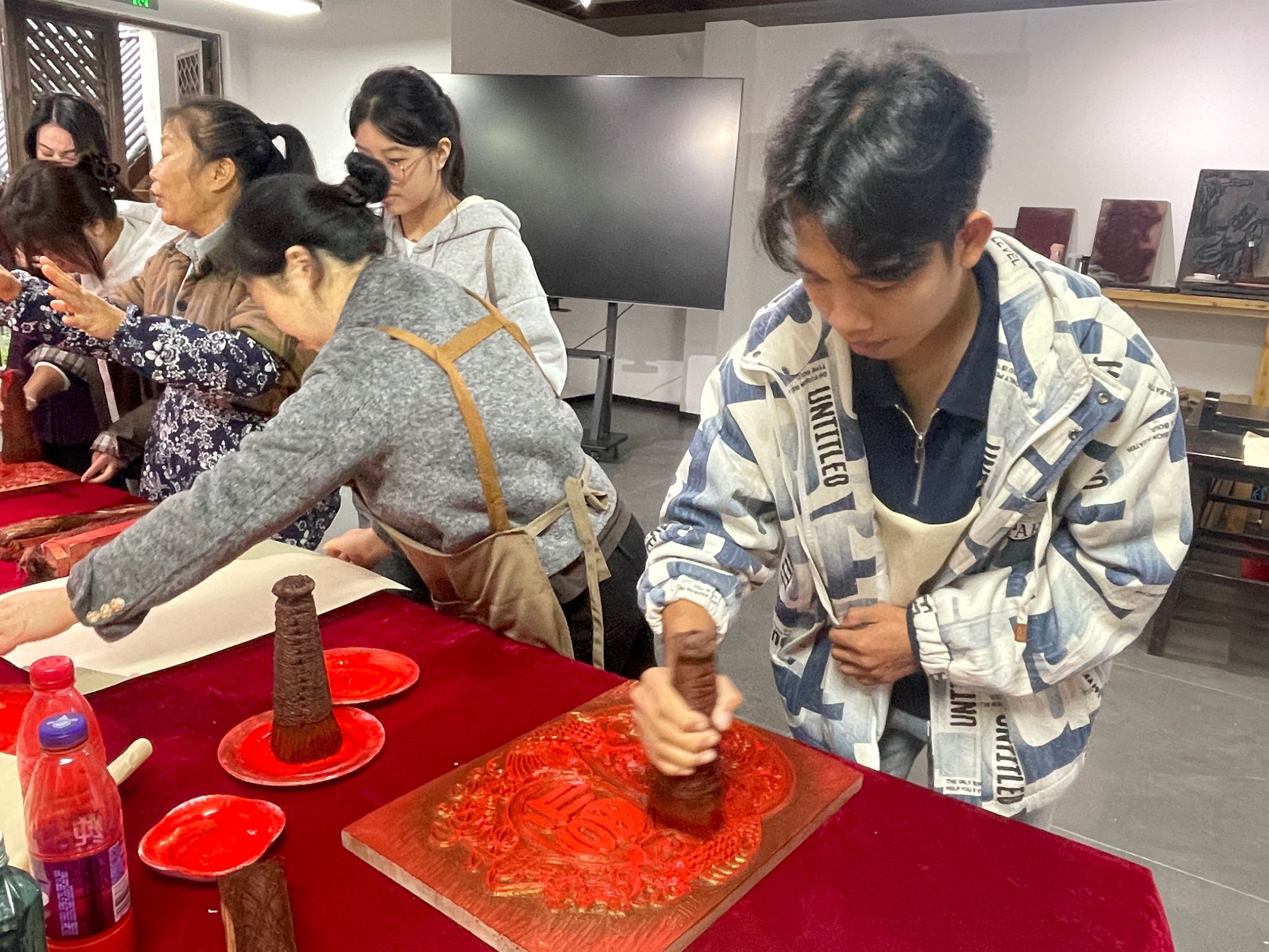 留学生们对这一传统技艺表现出浓厚兴趣,在张荣强老师的悉心点拨下,他们神情专注、动作谨慎,逐步完成属于自己的年画作品。当一幅幅色彩明艳、形象鲜活的年画从手中诞生时,在场师生均露出欣喜的笑容。中外学子在协作体验中进一步加深了对彼此文化的认知与理解,也让夹江年画这一传统非遗技艺在跨文化互动中焕发出新的时代活力。