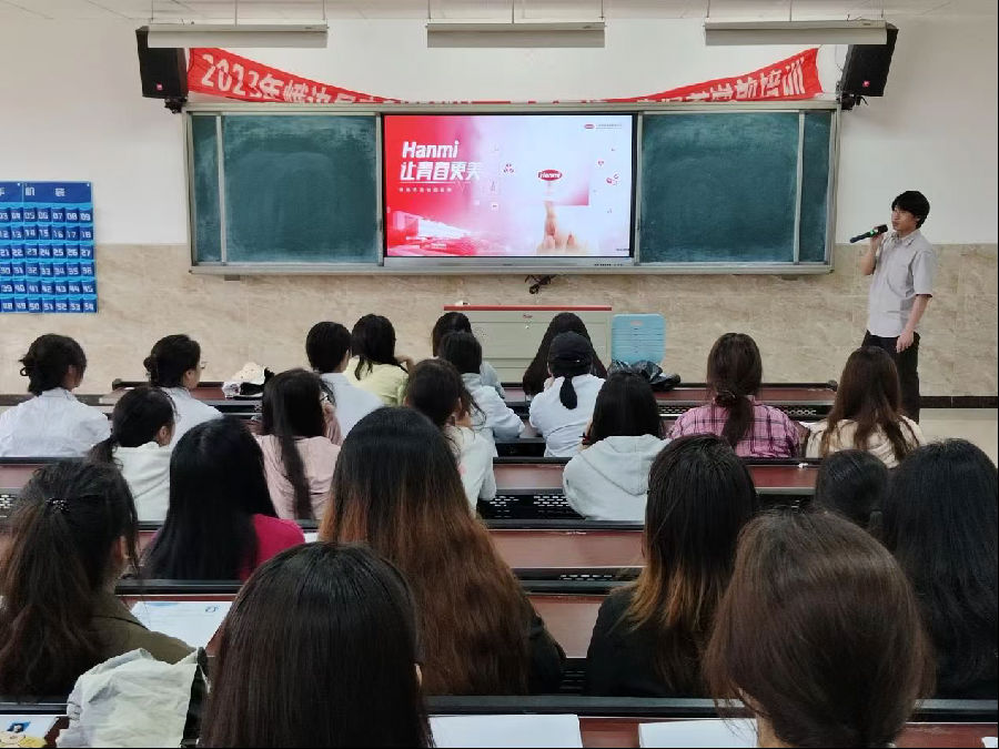 活动开始,北京韩美药品的负责人向各位同学介绍了韩美药业,接着通过PPT讲解北京韩美的核心竞争力,研发与事业前景,所需员工的岗位配对,社会公益以及员工福利等内容,来展开详细的介绍。在其细致的讲解后,通过提问环节和同学们进行良好深入的沟通,最后让有意向加入企业的同学提交简历,进行简单的面试答疑解惑,宣讲活动由此结束。