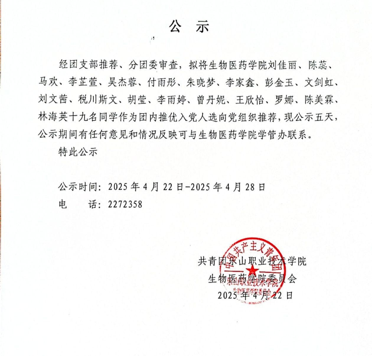 上一条: 生物医药学院2025年春季学期 拟推荐群众成为共青团员名单公示