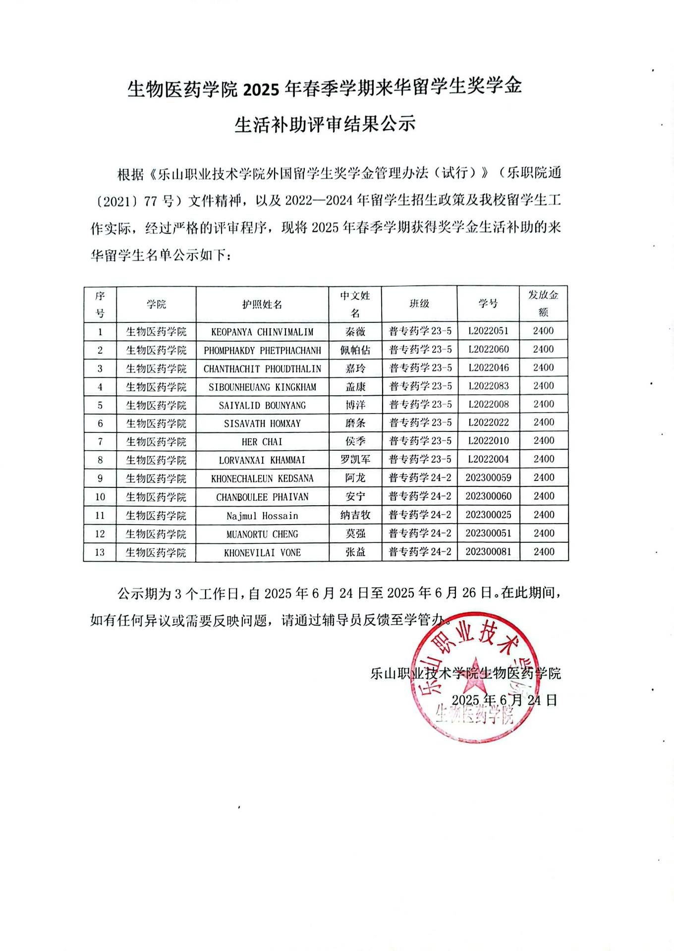 生物医药学院2025 年春季学期来华留学生奖学金 生活补助评审结果公示