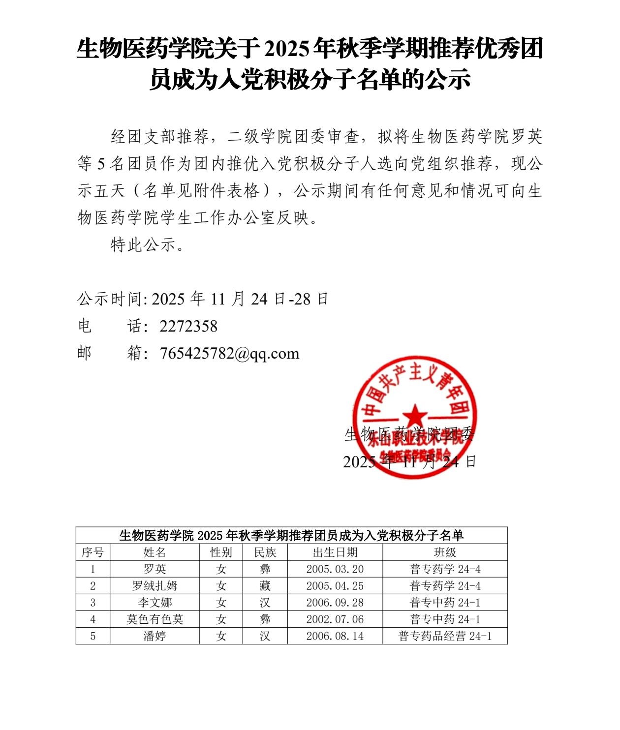生物医药学院关于2025年秋季学期推荐优秀团员成为入党积极分子名单的公示