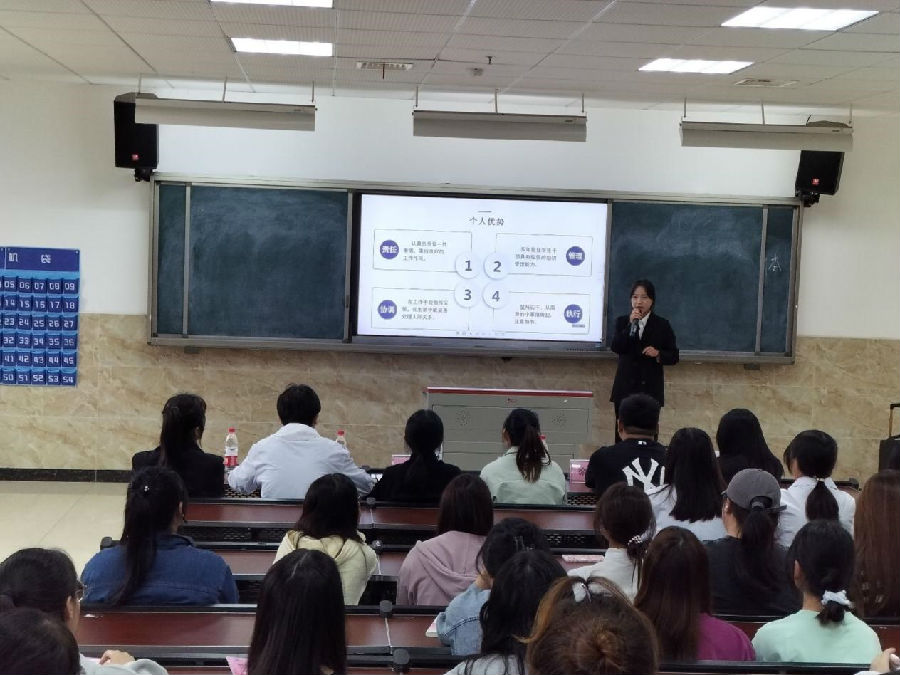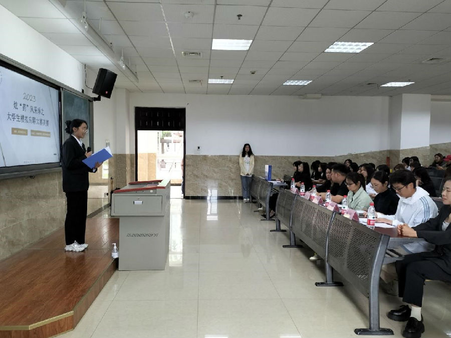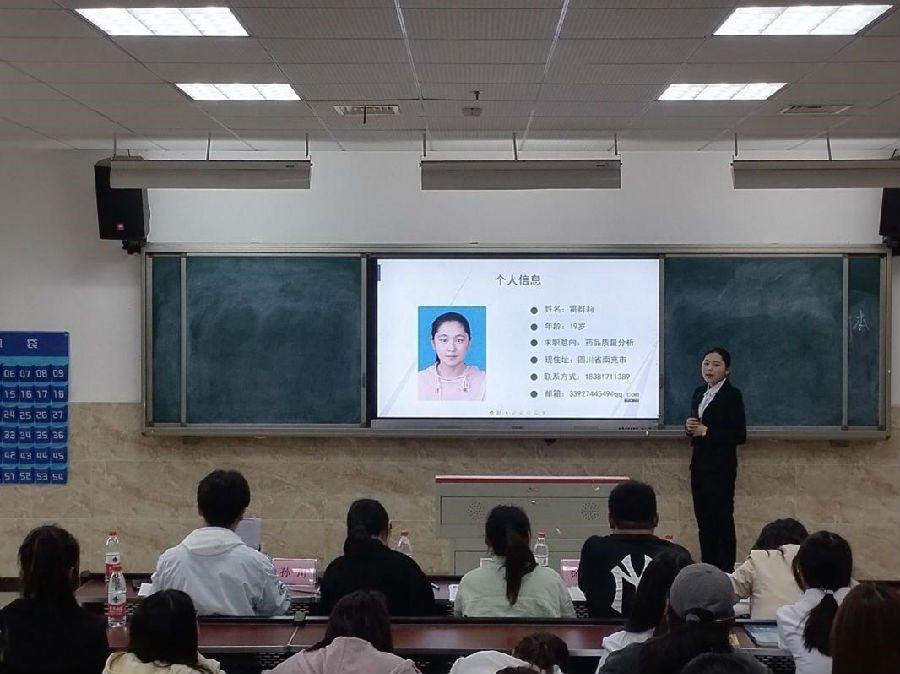 活动分为自我介绍、选手答辩两个环节。在自我介绍环节,参赛选手依次上台进行4分钟的自我介绍,展现出自己的专业、素质优势;随后是选手答辩环节,评委们从不同的职位、不同的角度向选手们进行提问。比赛现场气氛活跃,选手们充满激情地进行自我展示,充分展现了大学生朝气蓬勃的精神风貌。经过激烈角逐,雷群莉荣获第一名,陈漆琪、廖茜渝荣获第二名,刘嘉琳、谢雨欢、向思睿荣获第三名。