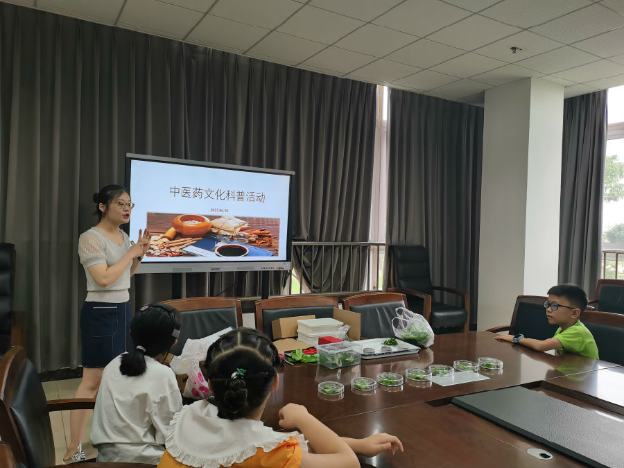 2022年6月28日,药学系教师周莉江、陈曦、李静华、杨笛笑等老师以《弘扬中华国粹传承中医药文化》为主题开展了“中医药文化进校园科普知识活动”,参加此次活动的对象主要是本系教职工子女,首先是主讲老师周莉江用通俗易懂的语言向小朋友介绍了《中医四大经典》、中药的类别和作用等知识,并以李商隐《无题·相见时难别亦难》诗中“春蚕到死丝方尽,蜡炬成灰泪始干”和大家讲授了蚕的奉献精神,并由此给大家讲了僵蚕和蚕沙都是中药,同时还带了部分中药介绍给大家认识。重点引导小朋友知晓中医药文化、中药的类别和作用。在“识物认药”环节,大家兴趣浓厚,与授课老师互动频频,“山楂”“红枣” “菊花”“橘皮”等回答异口同声、声音洪亮,活动现场气氛热烈、情绪高涨。主讲老师陈曦为小朋友展示了动物骨骼标本,主讲老师李静华和杨笛笑则通过中药小实验为大家展示了中医药文化的博大精深。