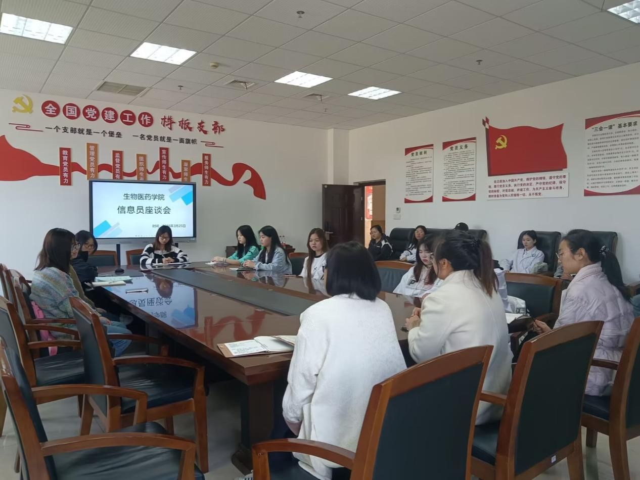 为进一步提高教学质量,解答并改进同学们在学习、生活中出现的问题。2025年3月25日星期二,生物医药学院学习部组织各班信息员在二号教研楼201会议室召开了3月信息员座谈会,出席本次活动的领导老师有生物医药学院副院长朱链链老师、生物医药学院总支副书记黎缘老师、生物医药学院督导干事蒋晓娟老师,23级、24级各班信息员均参会。