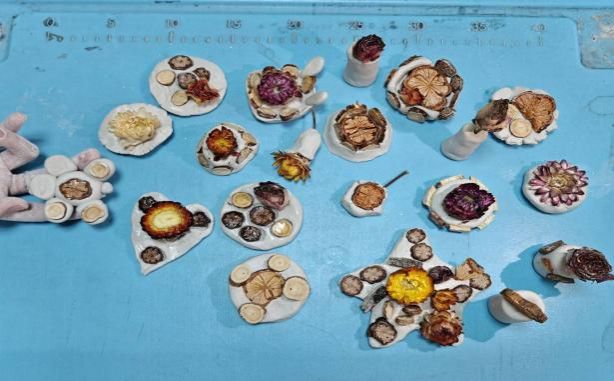 主持人通过图片和口述说明标本制作流程后,同学们在工作人员指导下动手制作植物标本。流程包括:选择植物样本、捏制风干粘土基底、整理植物形态、压制固定、涂层保护。同学们精心设计粘土造型,合理摆放植物样本,在操作中掌握标本制作技巧,加深对药用植物的认识。