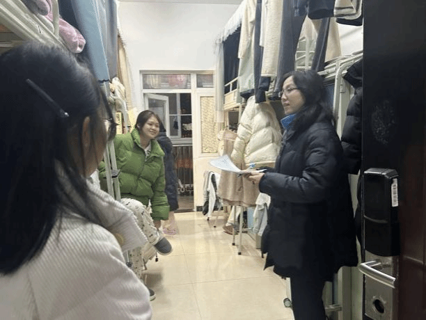 检查组首先对两栋宿舍的归寝情况进行核实。针对女生3A栋,靳婕书记带领辅导员卢妮娜、卢雪、李静华、蒋晓娟逐间寝室核对人数,确认全体学生均已按时返校,无晚归、未归现象。男生2A栋则由学管办干事张俊老师与值周教师韩广田、辅导员谢雨芩联合检查,同样未发现异常情况。检查过程中,老师们还亲切询问学生生活需求,提醒冬季注意防寒保暖,体现人文关怀。