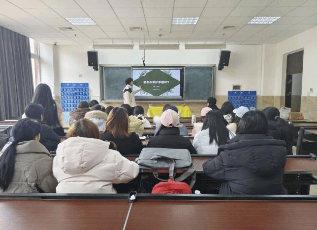 活动开场环节,主持人以"二九时节养生文化"为主题展开专题讲解。结合《黄帝内经·四气调神大论》中"冬三月,此谓闭藏"的经典论述,详细讲解了冬季手部防护的生理学依据与肌肤保养的中医药理论基础。在理论教学阶段,主持人通过图文形式,详细介绍了甘草、当归、白芷等道地药材的性味归经与护肤功效。重点解析了中药护手霜的配方原理:以甘草提取物抗炎舒缓,配伍当归精油促进血液循环,佐以白芷粉美白润肤。随后播放制作流程视频,进入实践操作环节。工作人员分发预先准备的经灭菌处理的中药材提取液、天然蜂蜡、植物精油等原料。参与者分组后,在专业指导教师的示范下,按照"药材溶解-温度调控-乳化成型"的工艺流程进行护手霜制作。最后,成果展示阶段,各小组将成品置于展示台进行统一陈列,大家相互讨论,分享心得,现场氛围热闹非凡。
