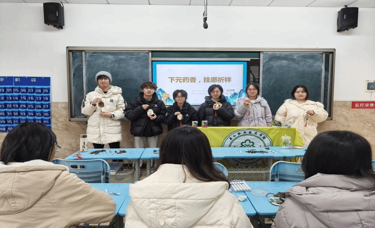 为传承中华优秀中医药文化,弘扬下元节祭祖祈福、消灾解厄的传统民俗,2025年12月19日,本草社开展“下元药香,挂愿祈祥”主题活动,本次活动以祈祥为核心载体,串联传统民俗礼仪与中华本草智慧。参与此次活动的有社团对接校领导封家福副校长,社团指导老师张俊,本草社、品冠乒乓球社一共25名社员。