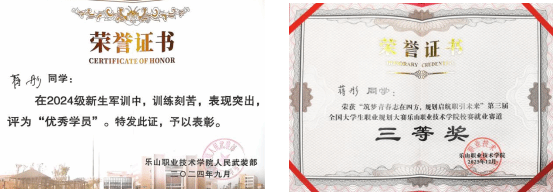 作为新时代的青年,她将军训淬炼出的纪律与韧性融入学业与职业发展。作为“军训优秀学员”,她以严谨自律筑牢成长根基;在职业生涯规划大赛中,她凭借对药学职业道路的清晰洞察与务实规划荣获佳绩,展现出目标明确、躬行实践的优秀特质。