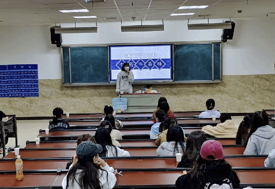 活动开始前半个小时,副社长及各位干事便到达活动地点开始场地的布置,外联干事进行活动所需PPT的调试,各位干事则是准备枸杞、决明子、菊花等药材和发放纸杯。当一切准备完毕,此次活动正式开始!首先,由外联干事以PPT的方式进行讲解,让同学们从中了解到所准备的中药材的功效。然后,同学们排队依次选择领取自己想要的药材进行泡茶。在等待泡茶的过程中,同学们互相分享交流自己所学的有关中医药的知识,随后又互相品尝各自的茶。