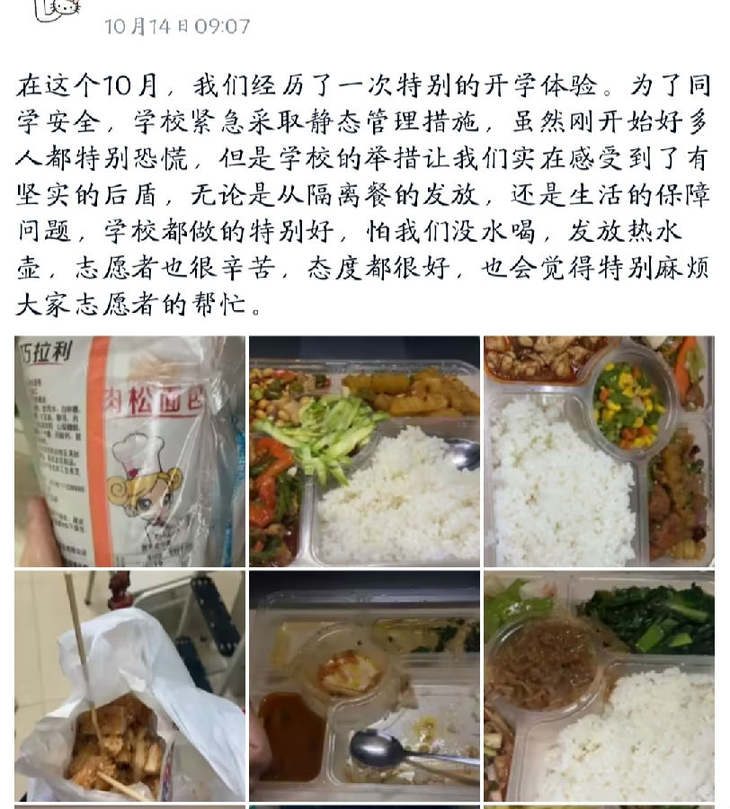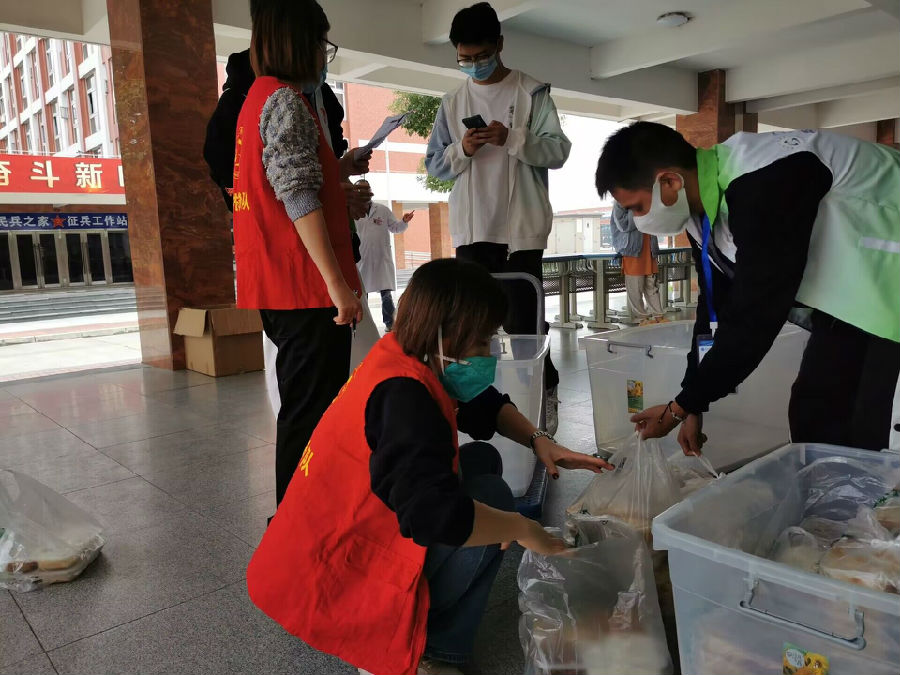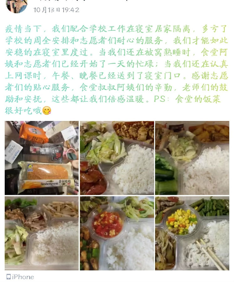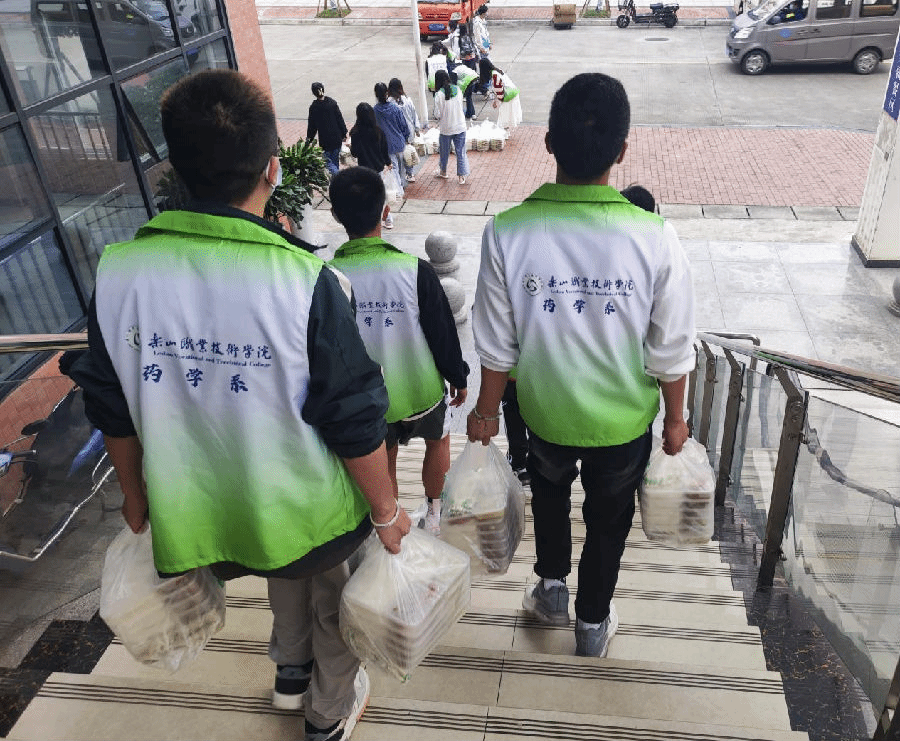 为切实保障每位学生一日三餐,药学系老师们和志愿者们用行动来承担新时代青年肩负的责任。活动前,药学系在各个班群里发布招募志愿者的信息,各班同学踊跃报名,积极参加,他们勇敢无畏,敢于担当。10月11日至10月14日老师们和志愿者们每天工作六、七个小时,志愿者们不怕苦不怕累,他们不仅为同学们送餐,还为大家提供打水、生活用品采买及代取快递等服务。隔离餐有些重、爬楼梯有些累、休息时间有些不够,但是老师们和志愿者们从没有说过一个苦,他们为同学们送去了关心和温暖,同学们纷纷表示深受触动,真心感激每一位老师和志愿者。