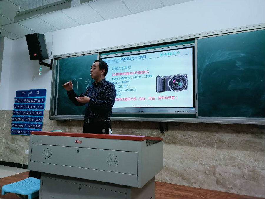 吴老师把个人工作经历融入写作和摄影讲座中,整个过程幽默风趣、深入浅出、气氛活跃。在讲解新闻写作时,重点突出了六要素和写作结构;在讲解摄影技巧时,借助摄影作品,详细讲解相片构图、曝光取景等细节,最后鼓励同学们多观察、善动脑、勤练习。